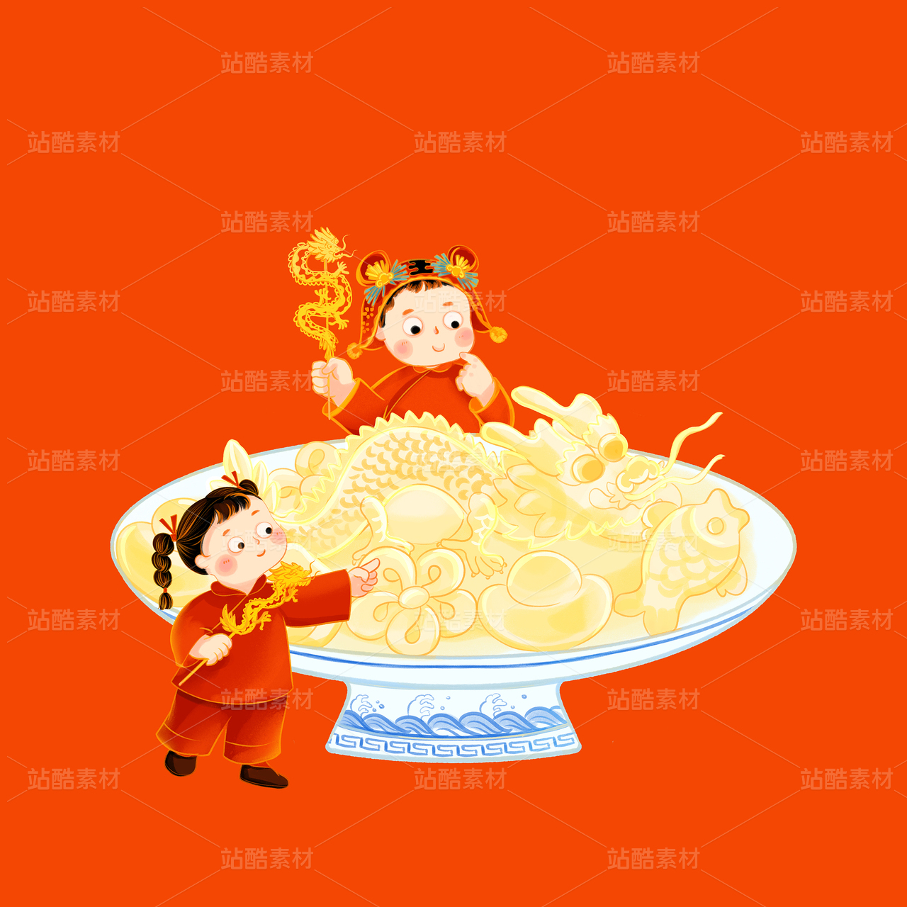 中國龍年春節(jié)龍形花饃糖畫小孩青花瓷插畫