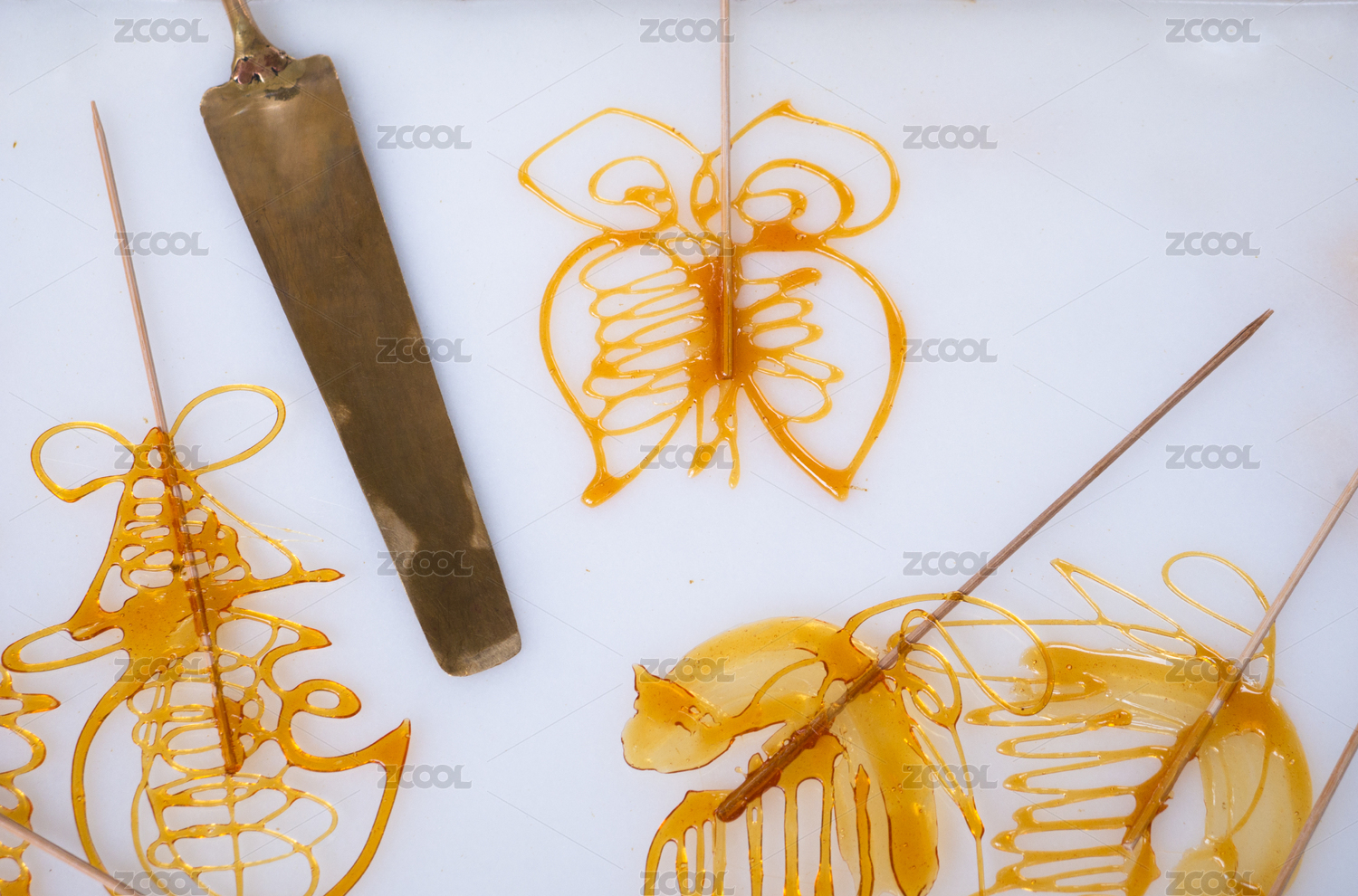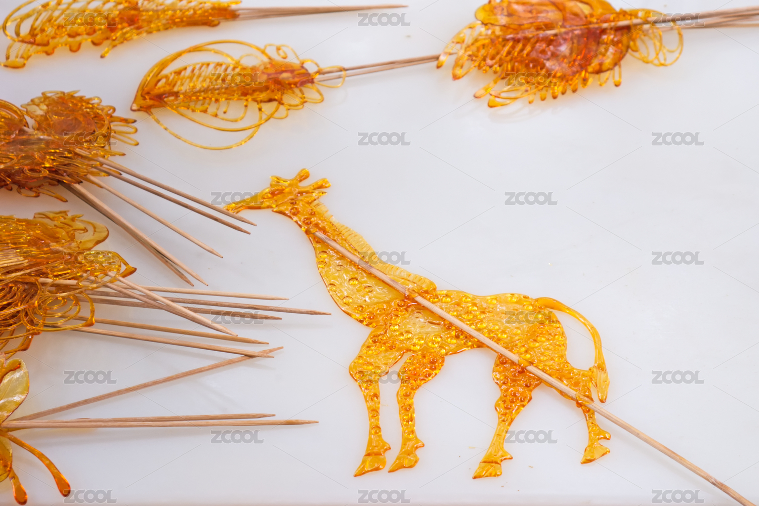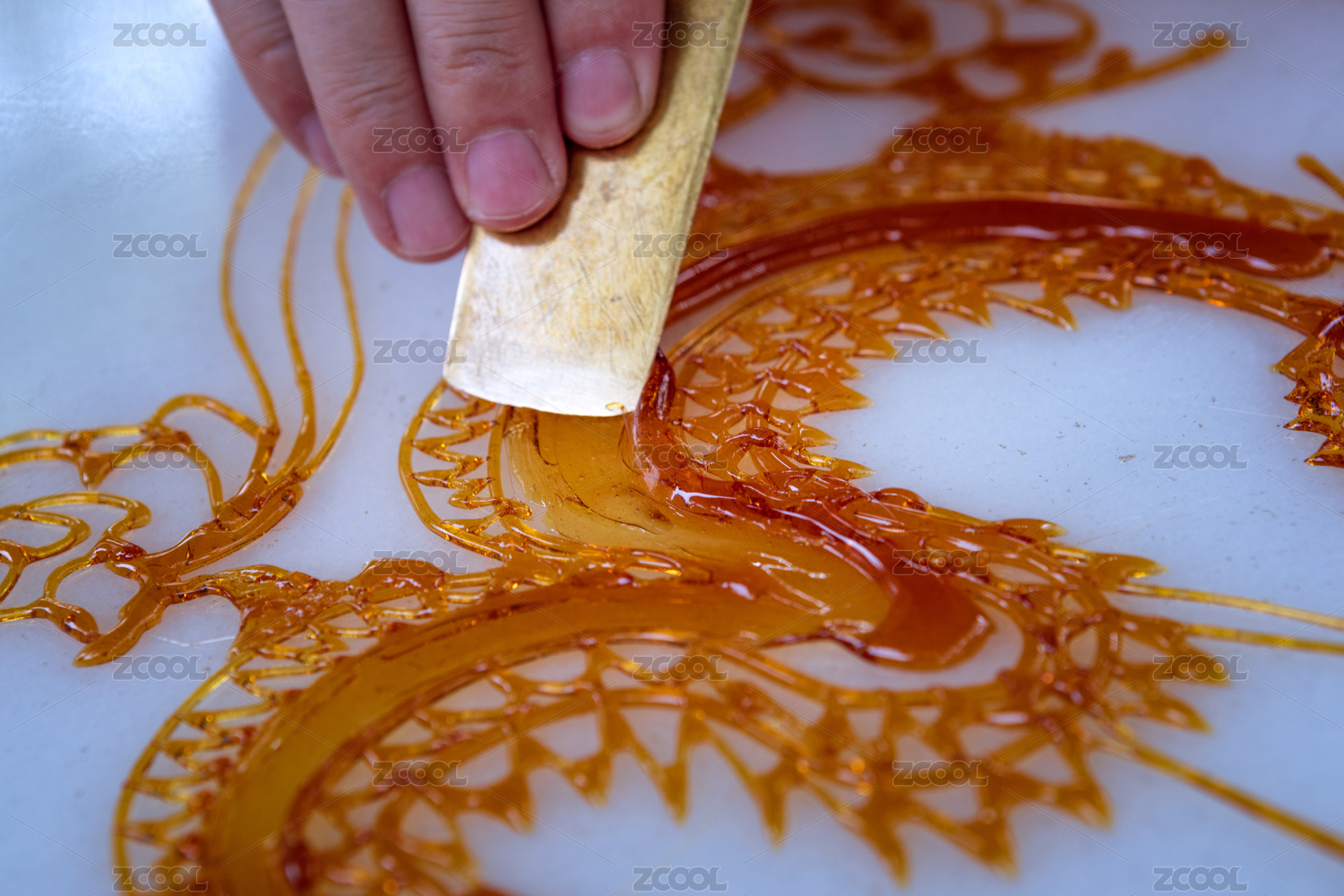 白色漢白玉石板上用黃色糖汁制作的中國民間傳統(tǒng)糖畫