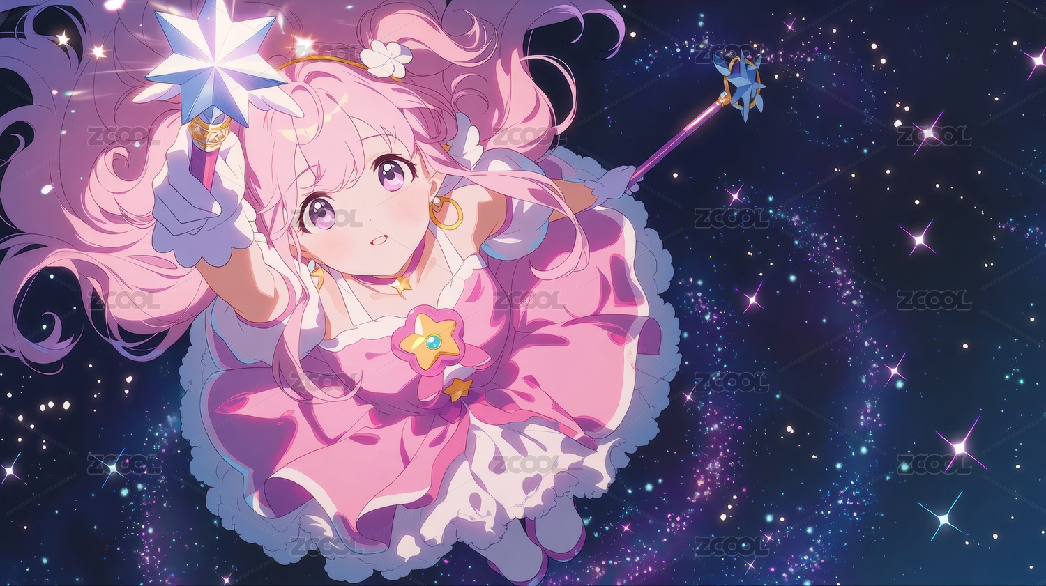 粉發(fā)魔法少女在夜空施展魔法手持閃亮星形法杖