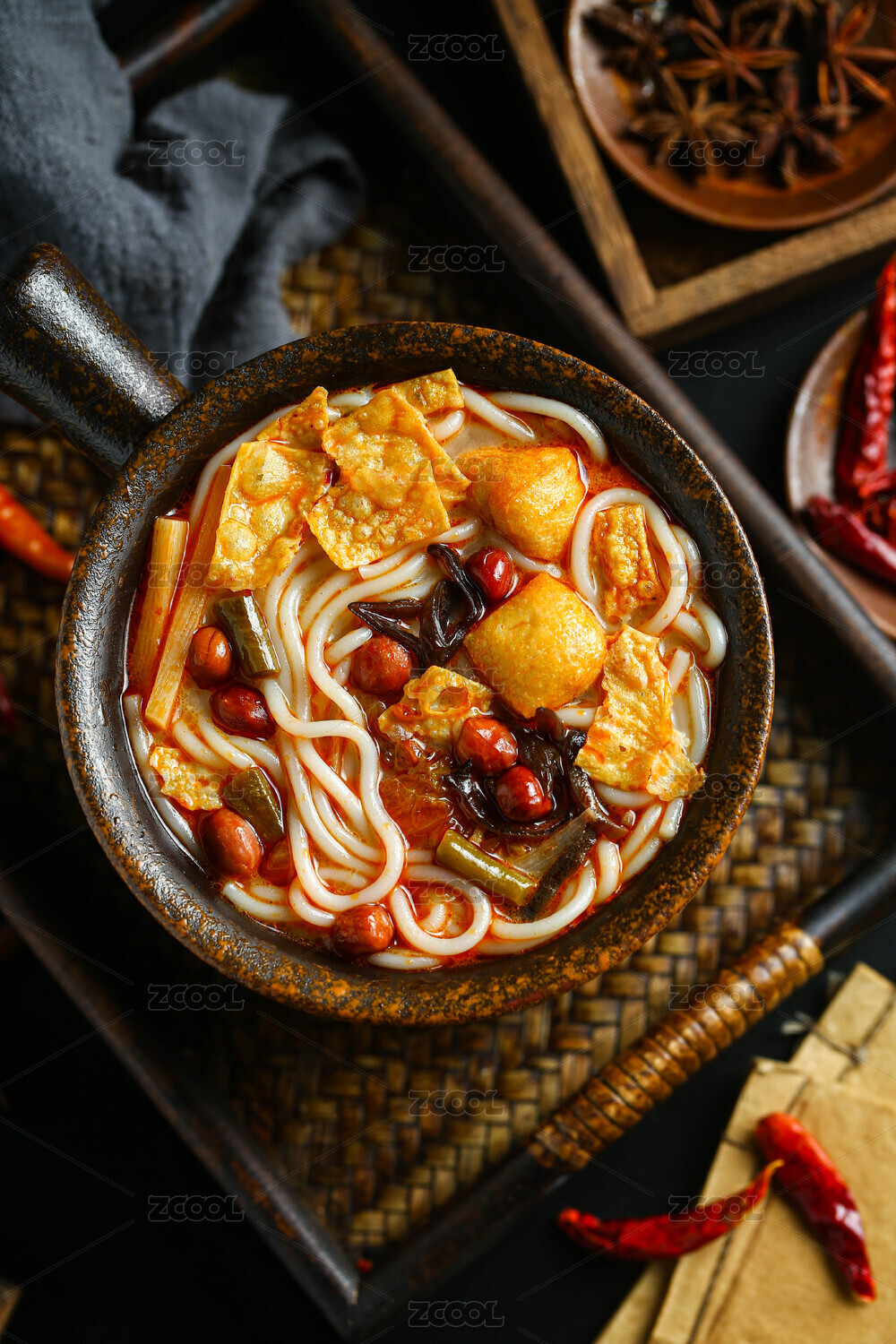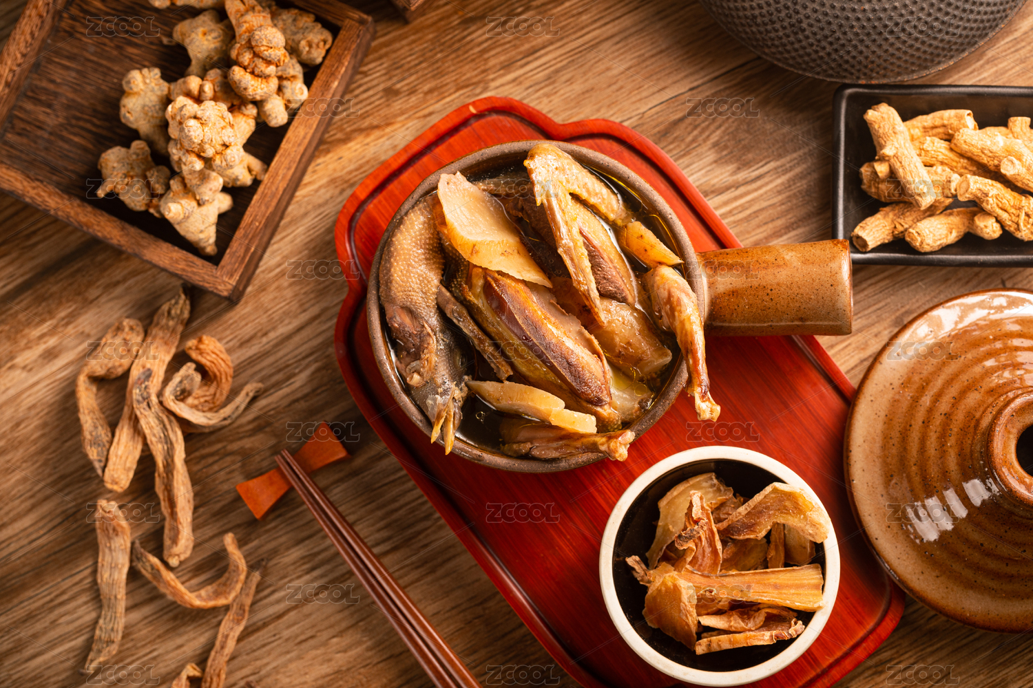 俯拍復(fù)古場(chǎng)景中裝在陶鍋中的天麻燉乳鴿