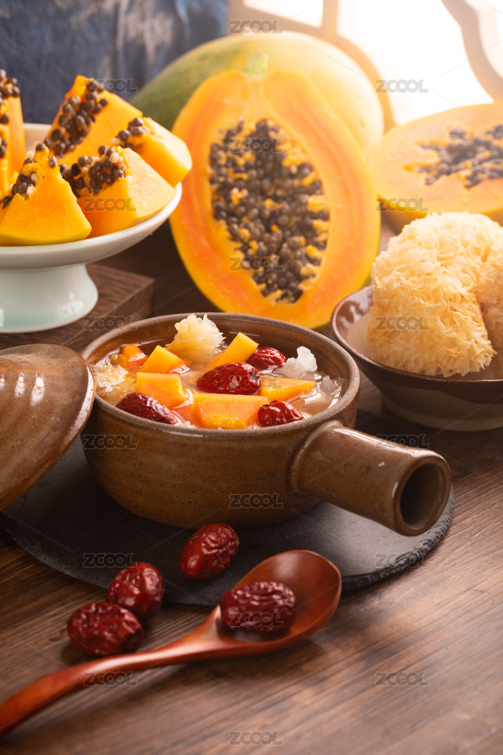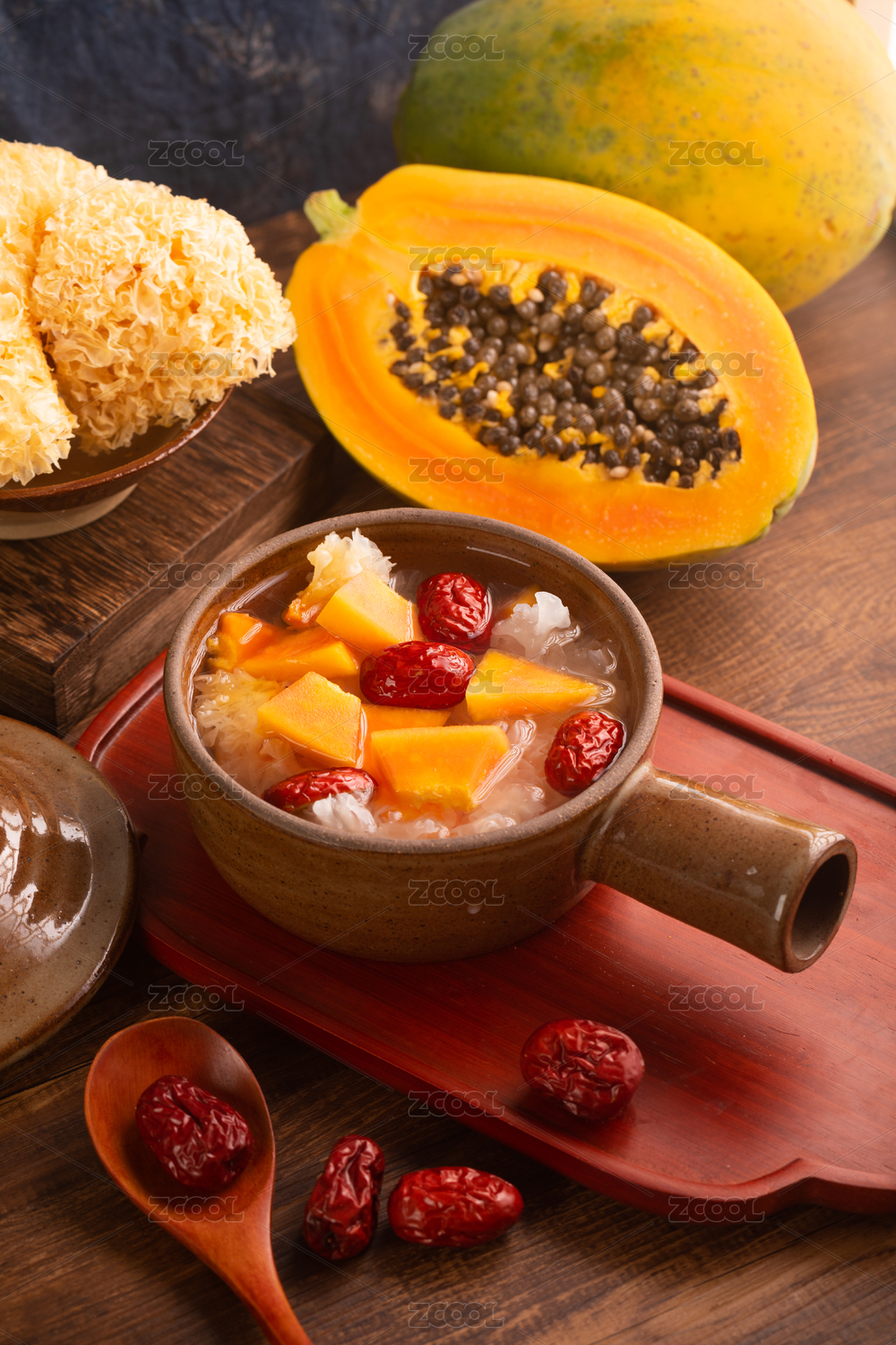 復(fù)古場(chǎng)景中裝在陶鍋中的木瓜紅棗燉銀耳