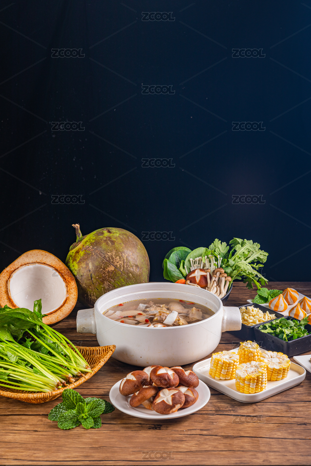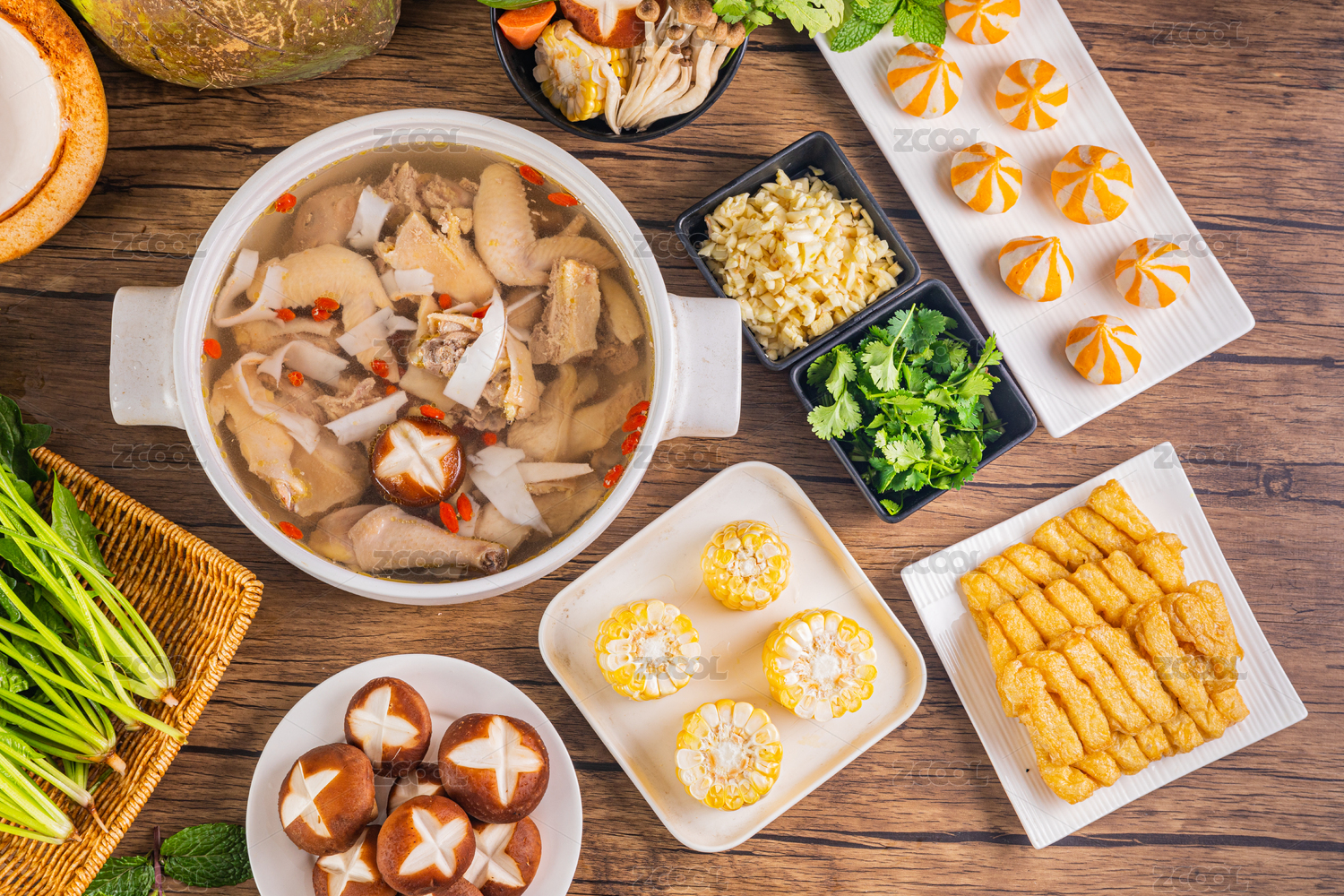 俯拍桌子上裝在陶鍋里的椰子雞火鍋和食材