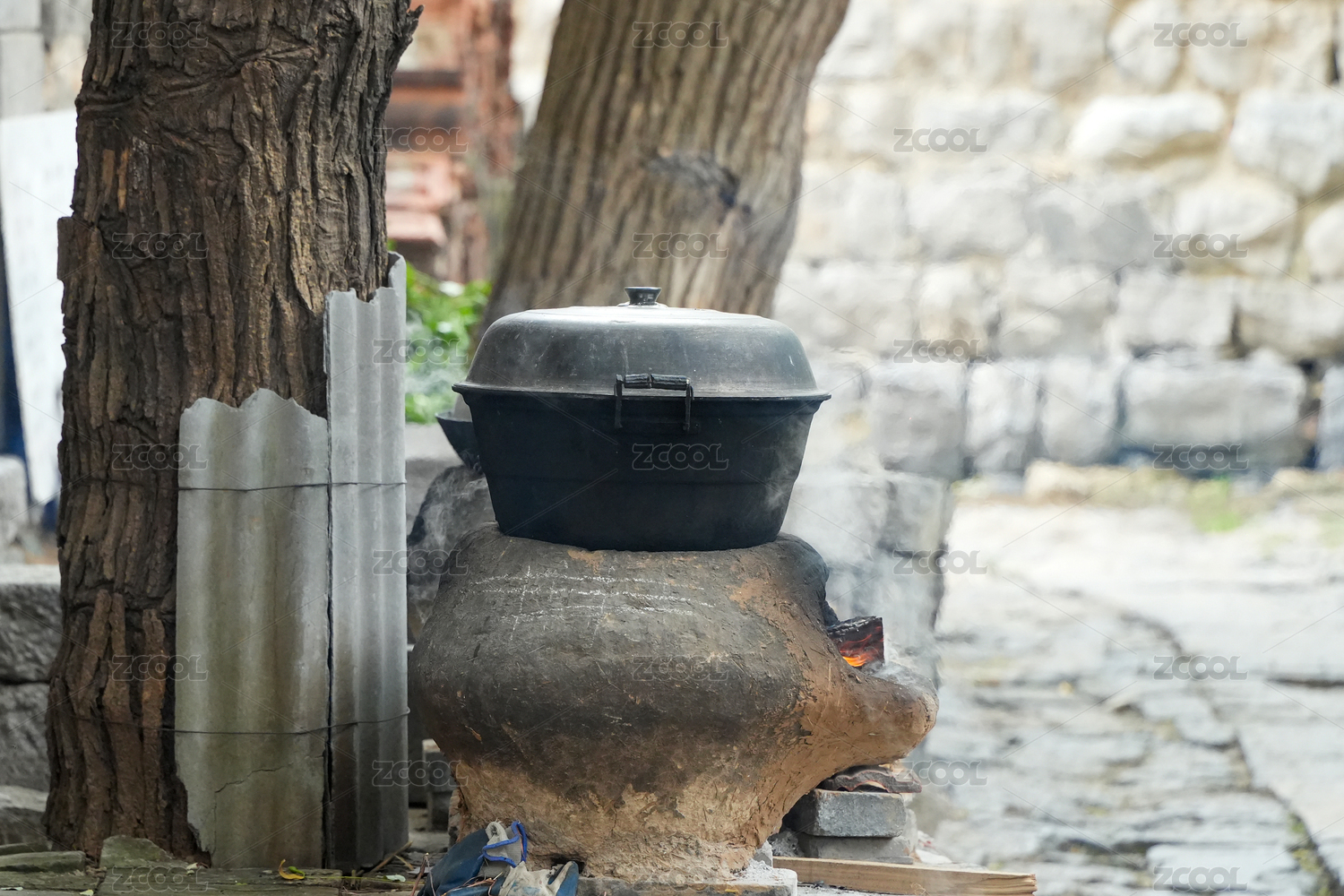 復(fù)古場(chǎng)景中裝在陶鍋中的銀耳紅棗燉木瓜