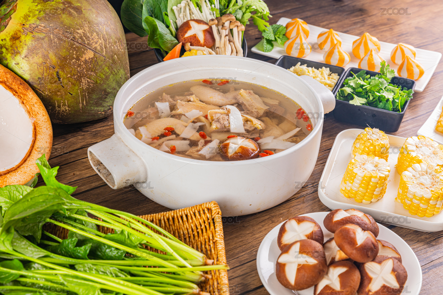 裝在陶鍋中的椰子雞火鍋和放在桌子上的食材