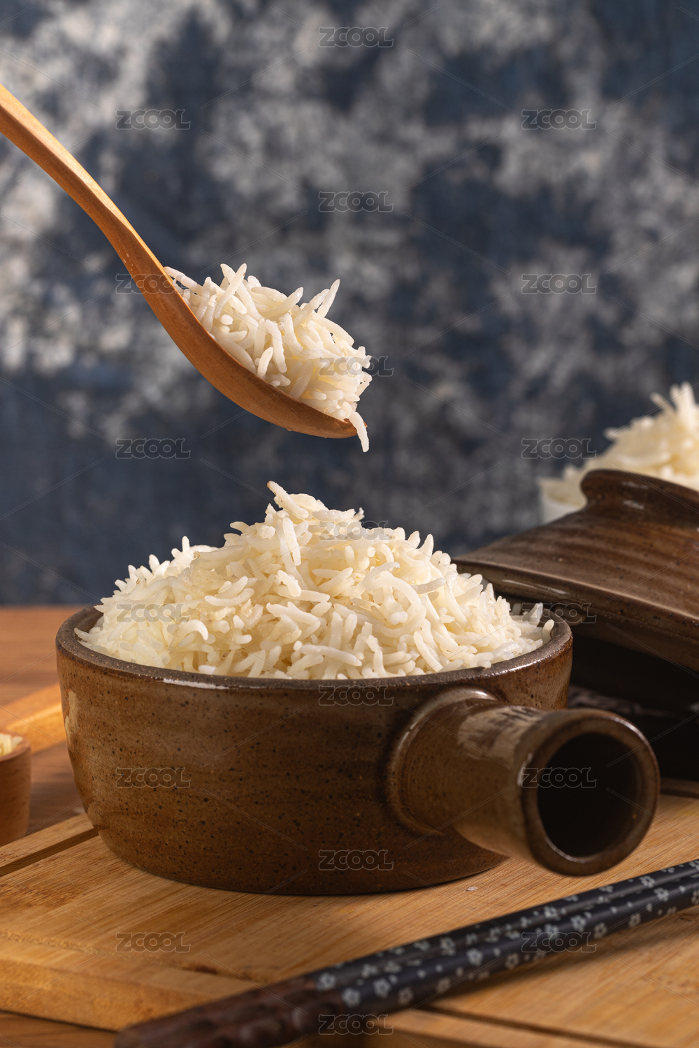 從陶鍋中舀起一勺長(zhǎng)粒米飯