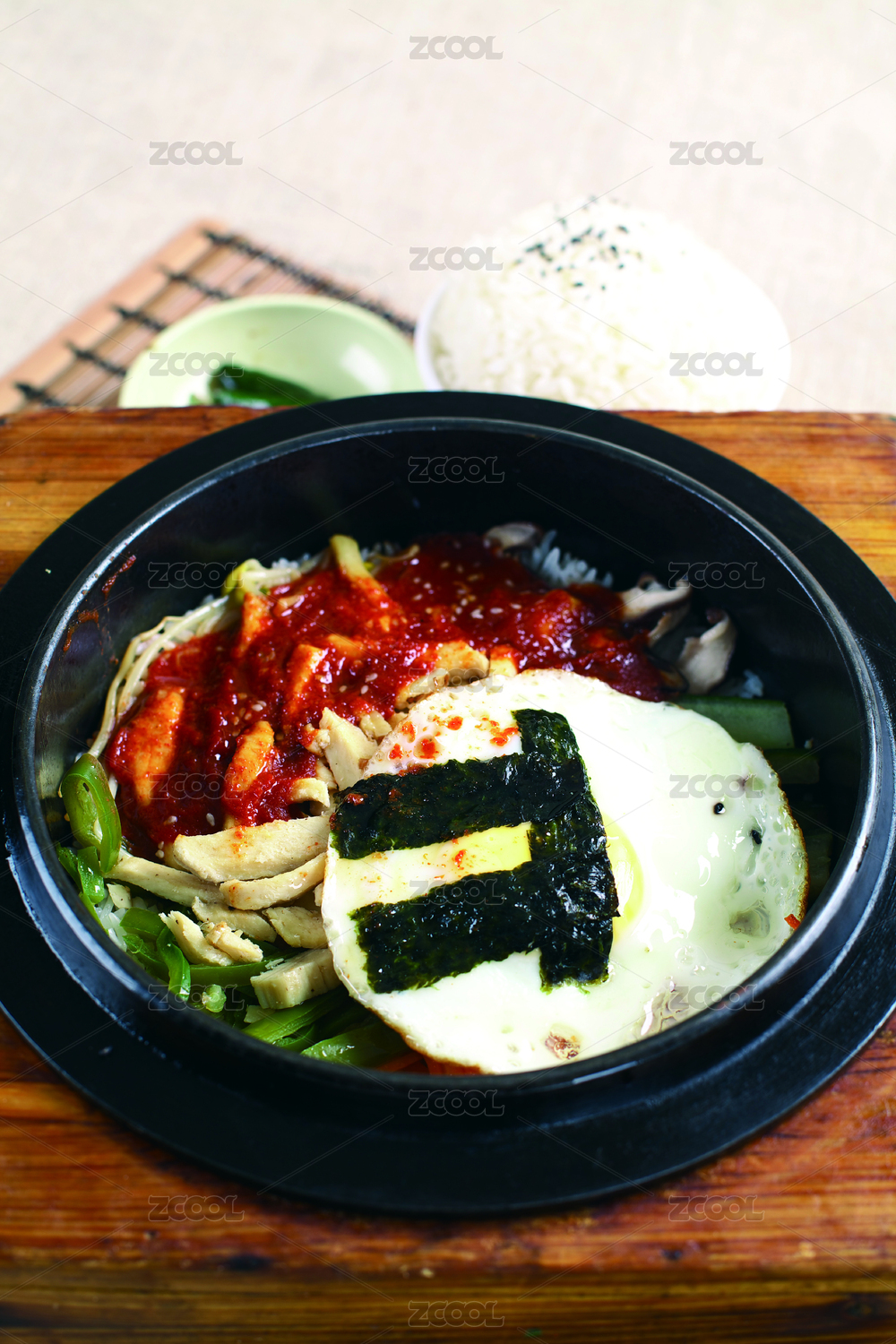 放在黑陶鍋里的雞肉石鍋拌飯