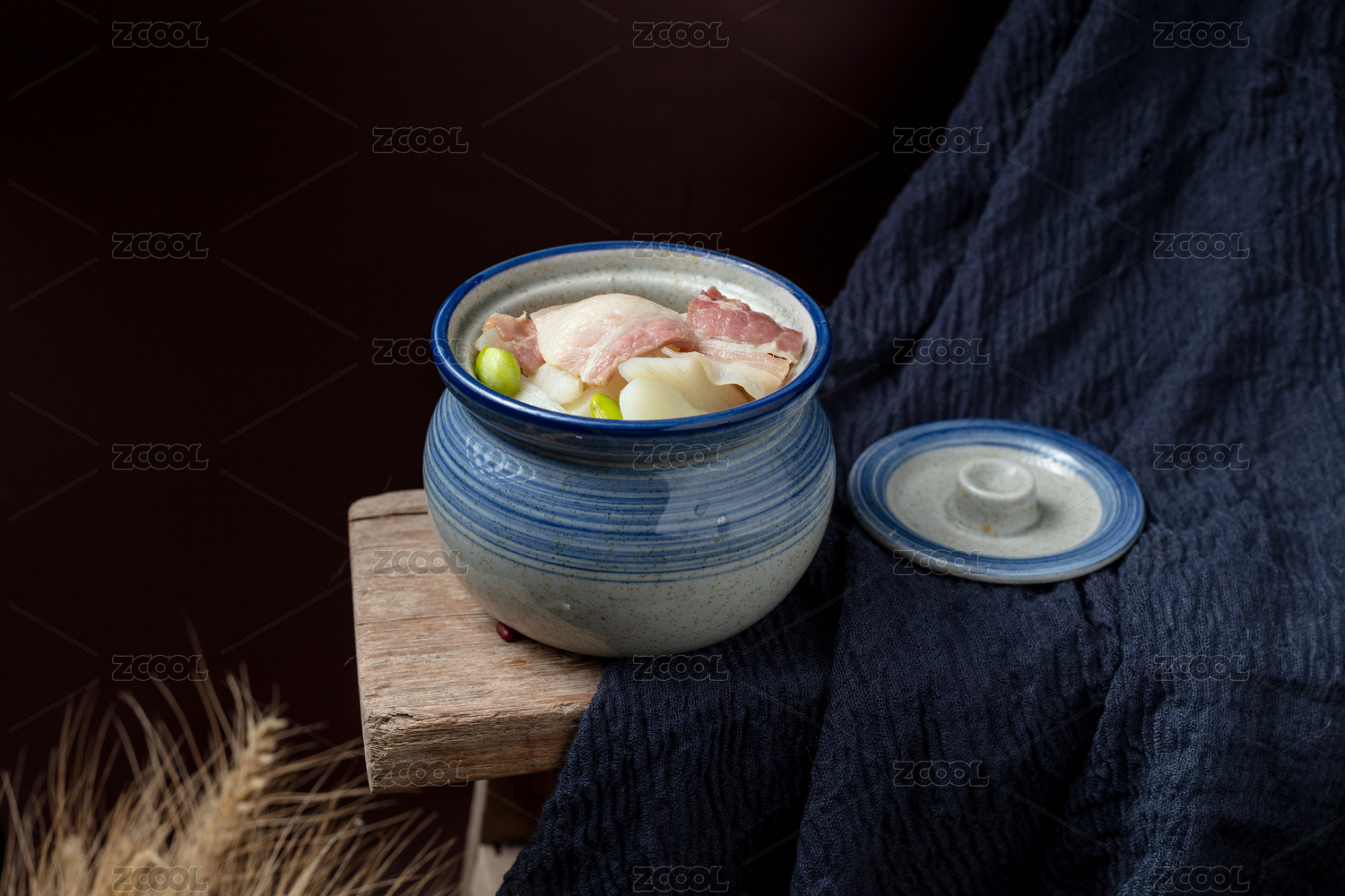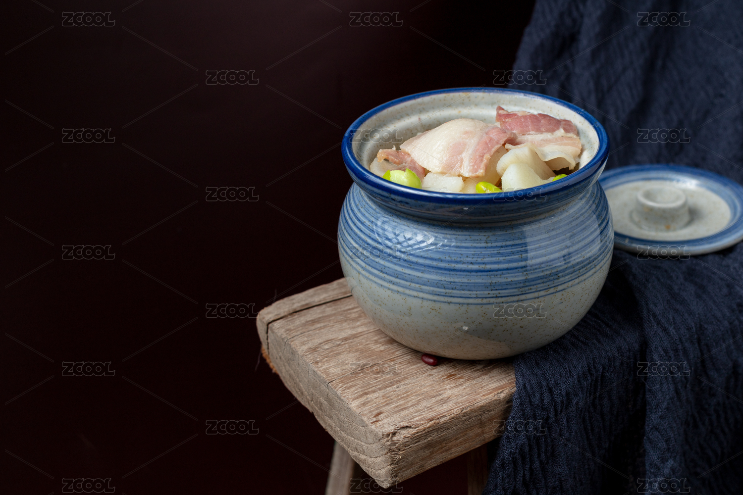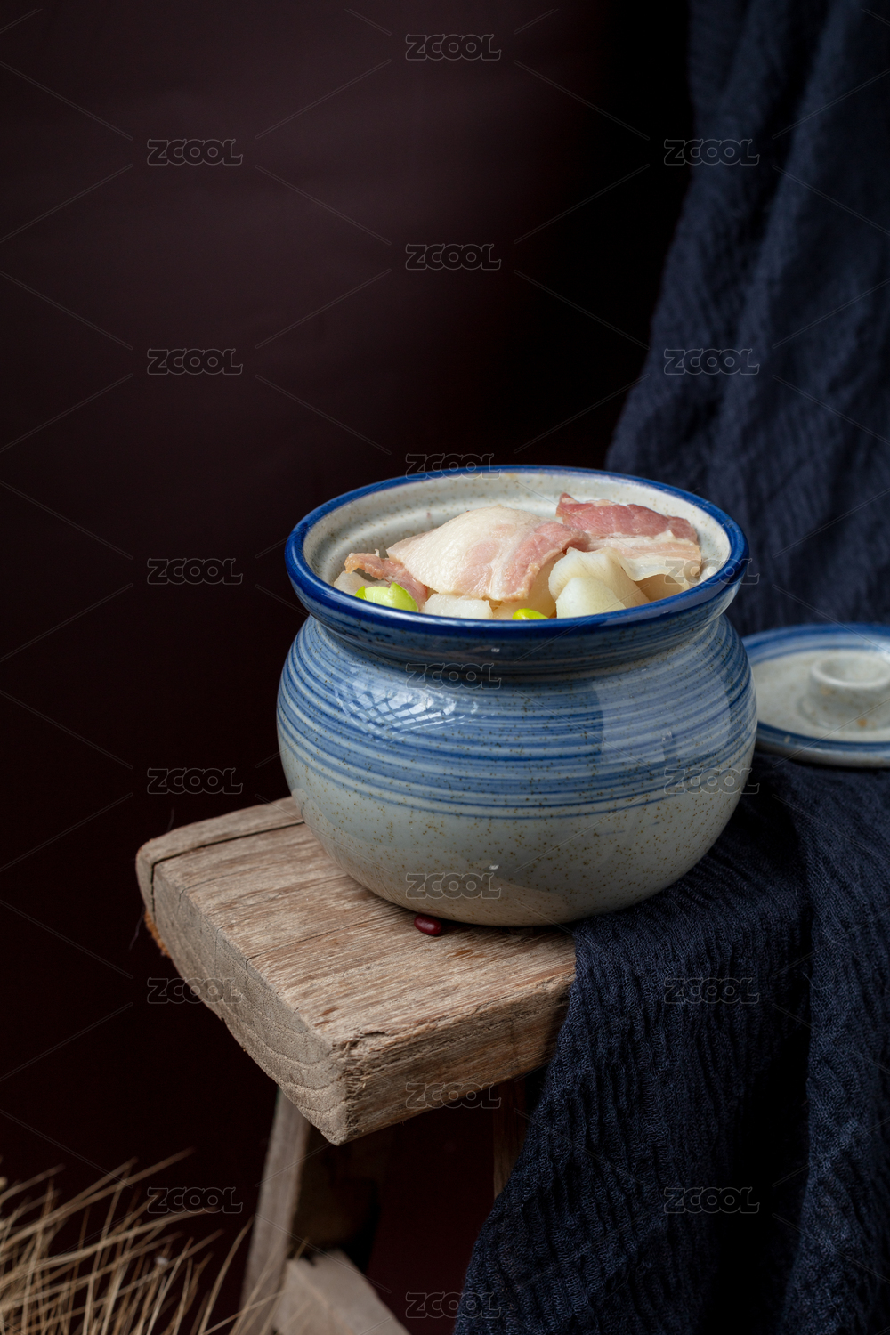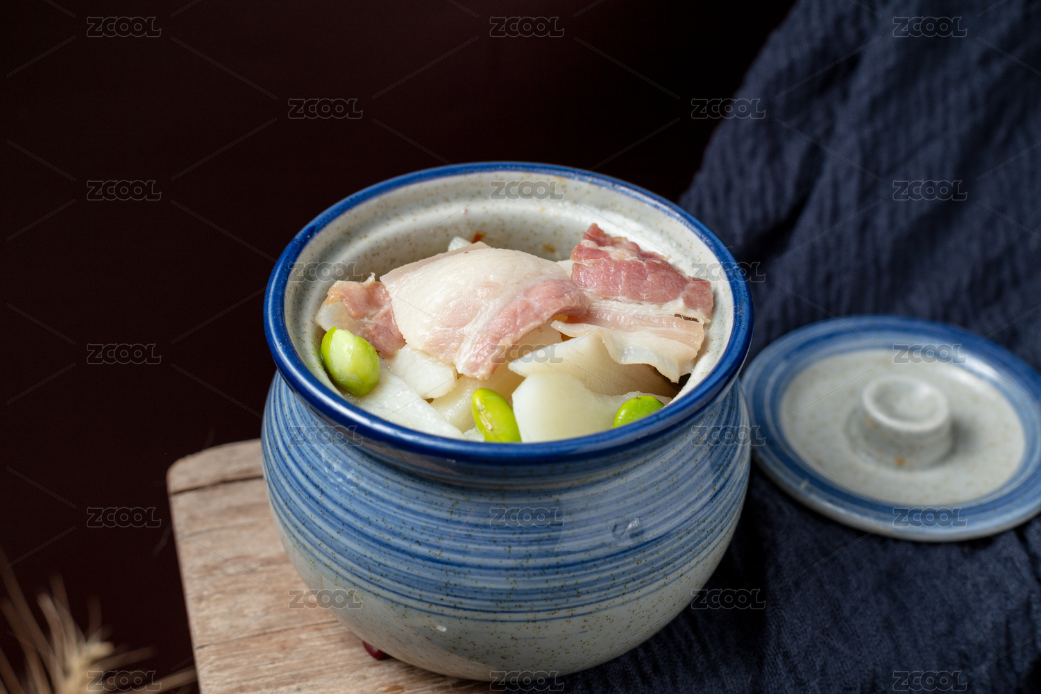 藍(lán)紋陶鍋裝山藥燒咸肉