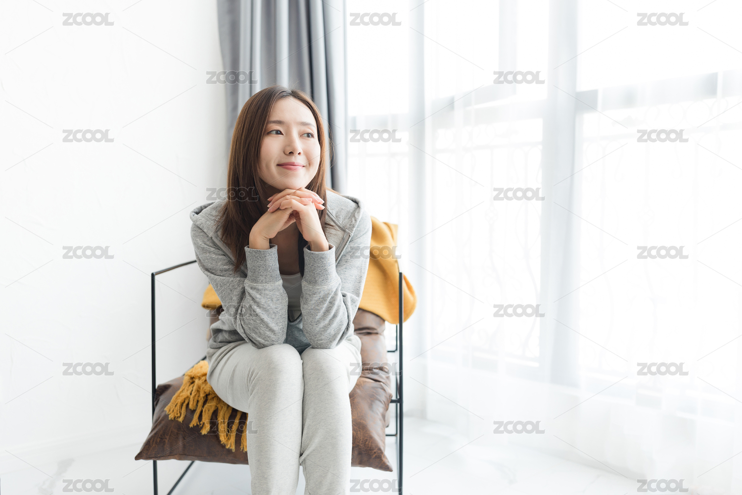 一個(gè)年輕女性在客廳坐在沙發(fā)椅上微笑看向窗外