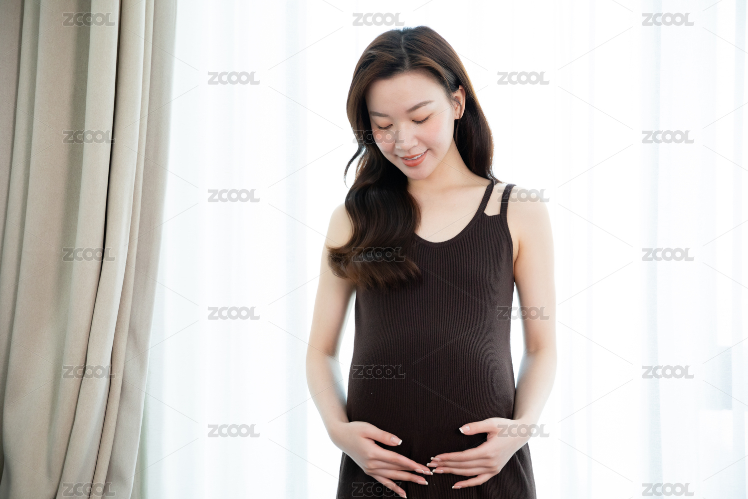 美麗孕婦站在窗簾前低頭微笑
