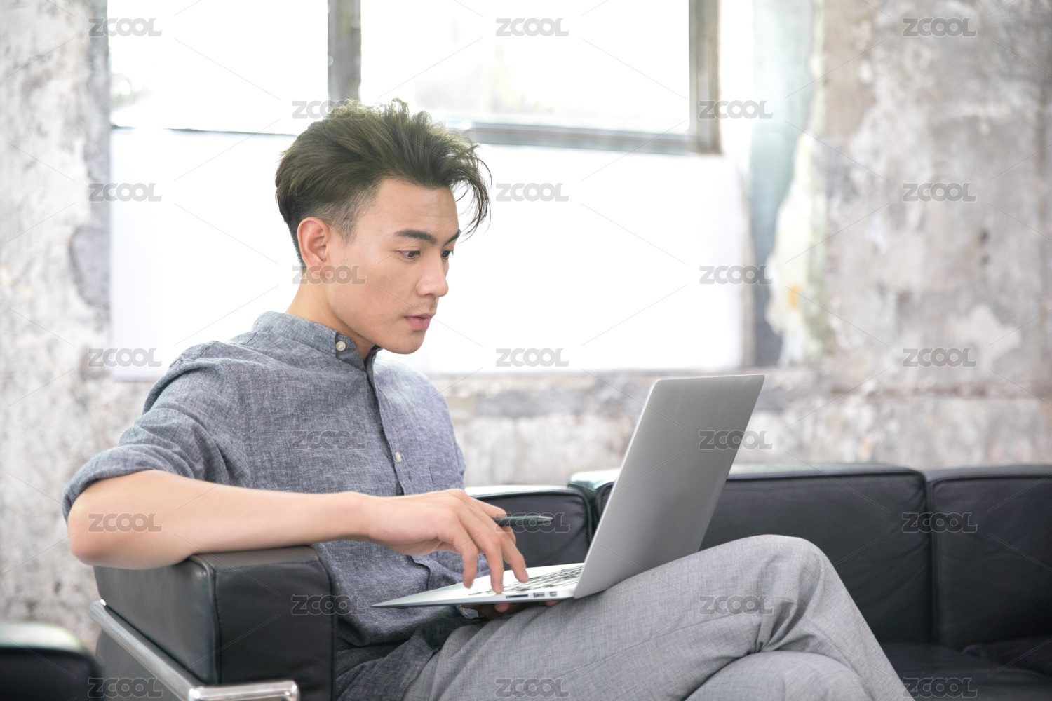 休閑姿勢(shì)坐在沙發(fā)上使用著放在腿上的筆記本電腦