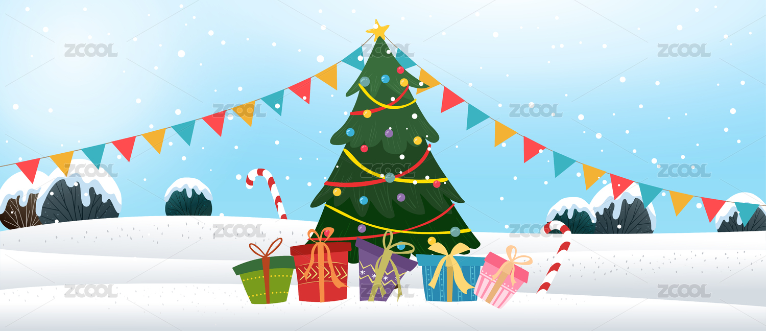 圣誕節(jié)圣誕樹禮品盒彩旗飄飄插畫矢量圖