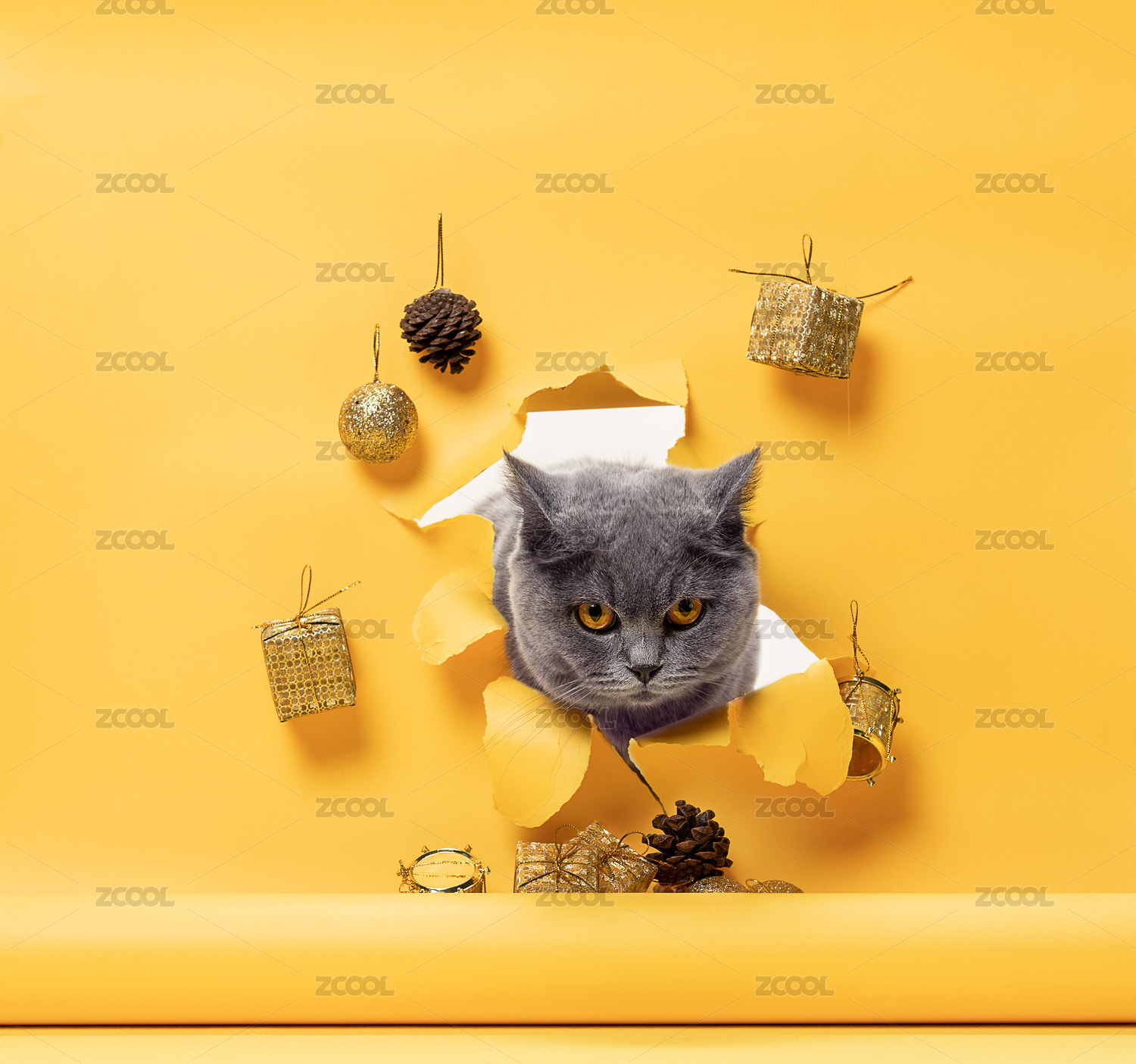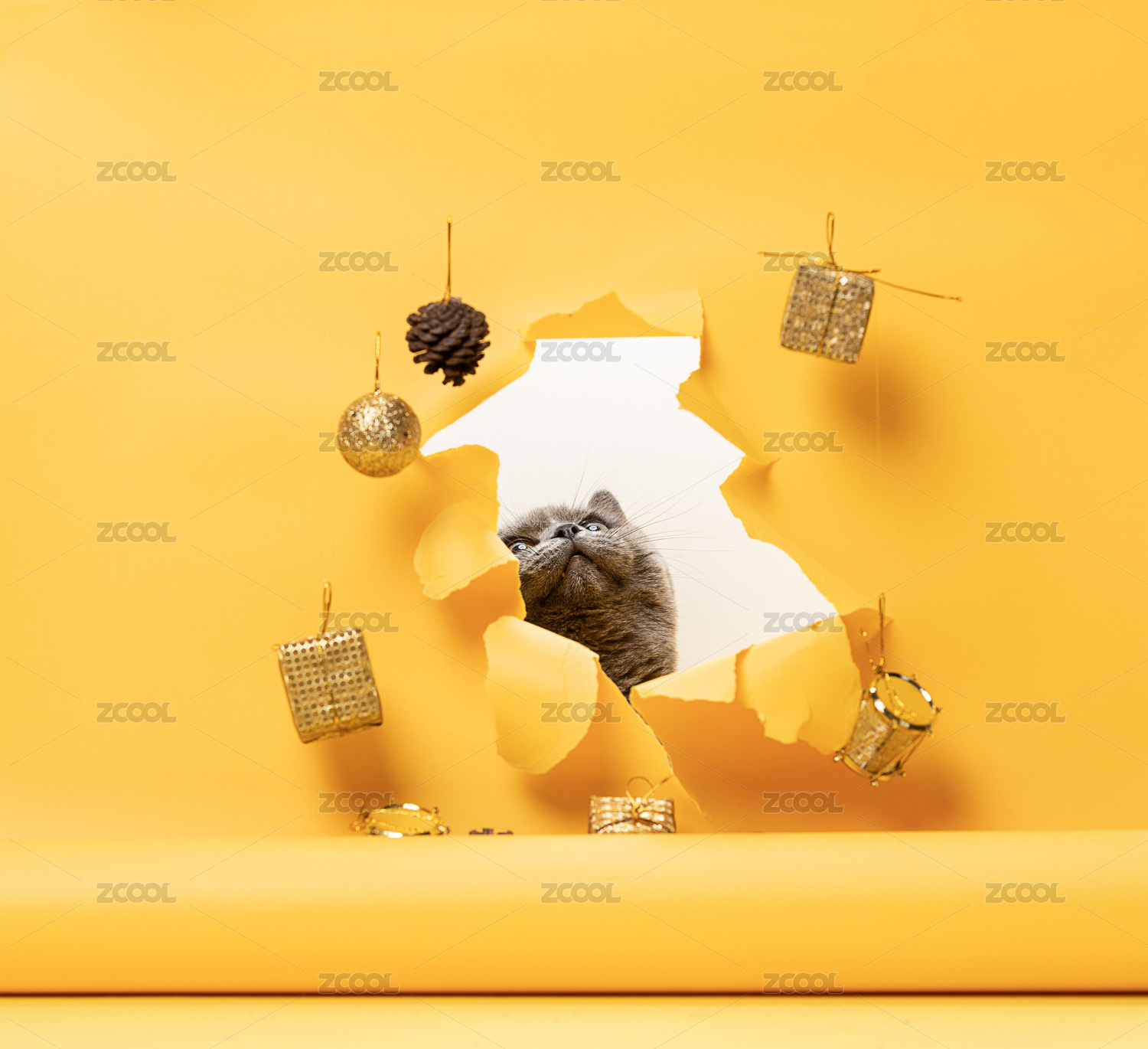 英短藍(lán)貓動態(tài)抓拍,黃色鏤空創(chuàng)意背景