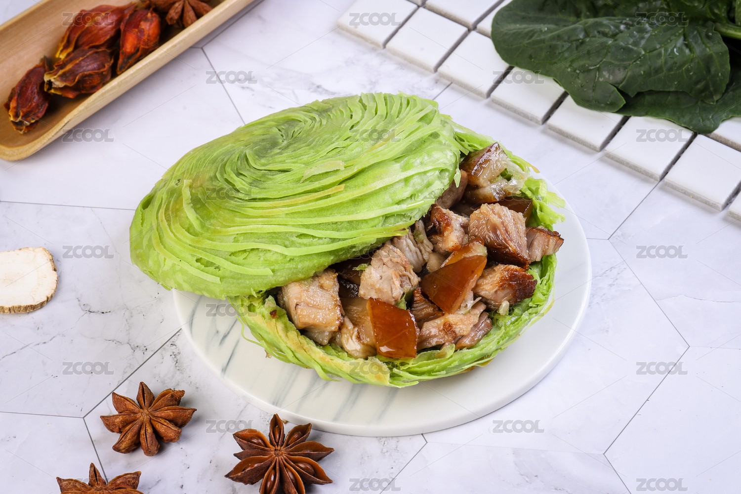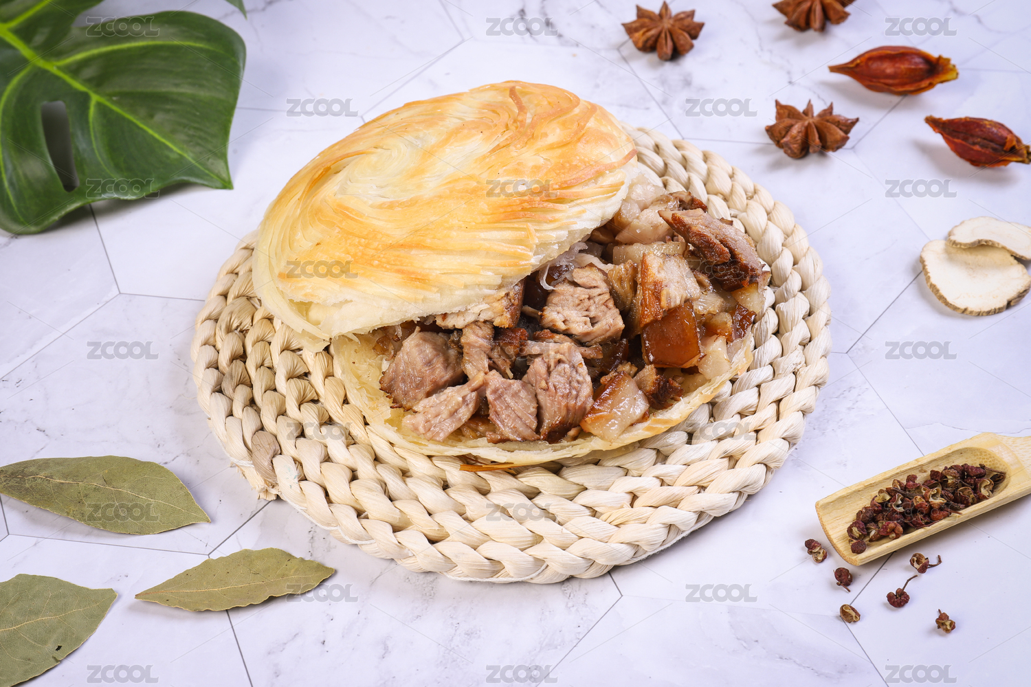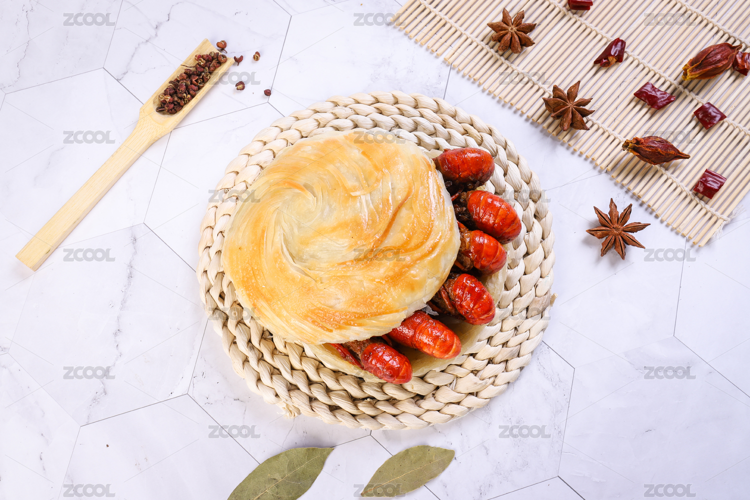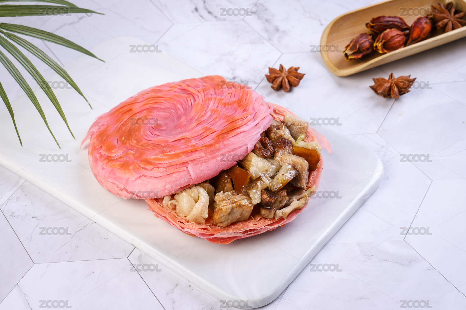 大理石背景墊子上的西安肉夾饃蝦肉夾饃