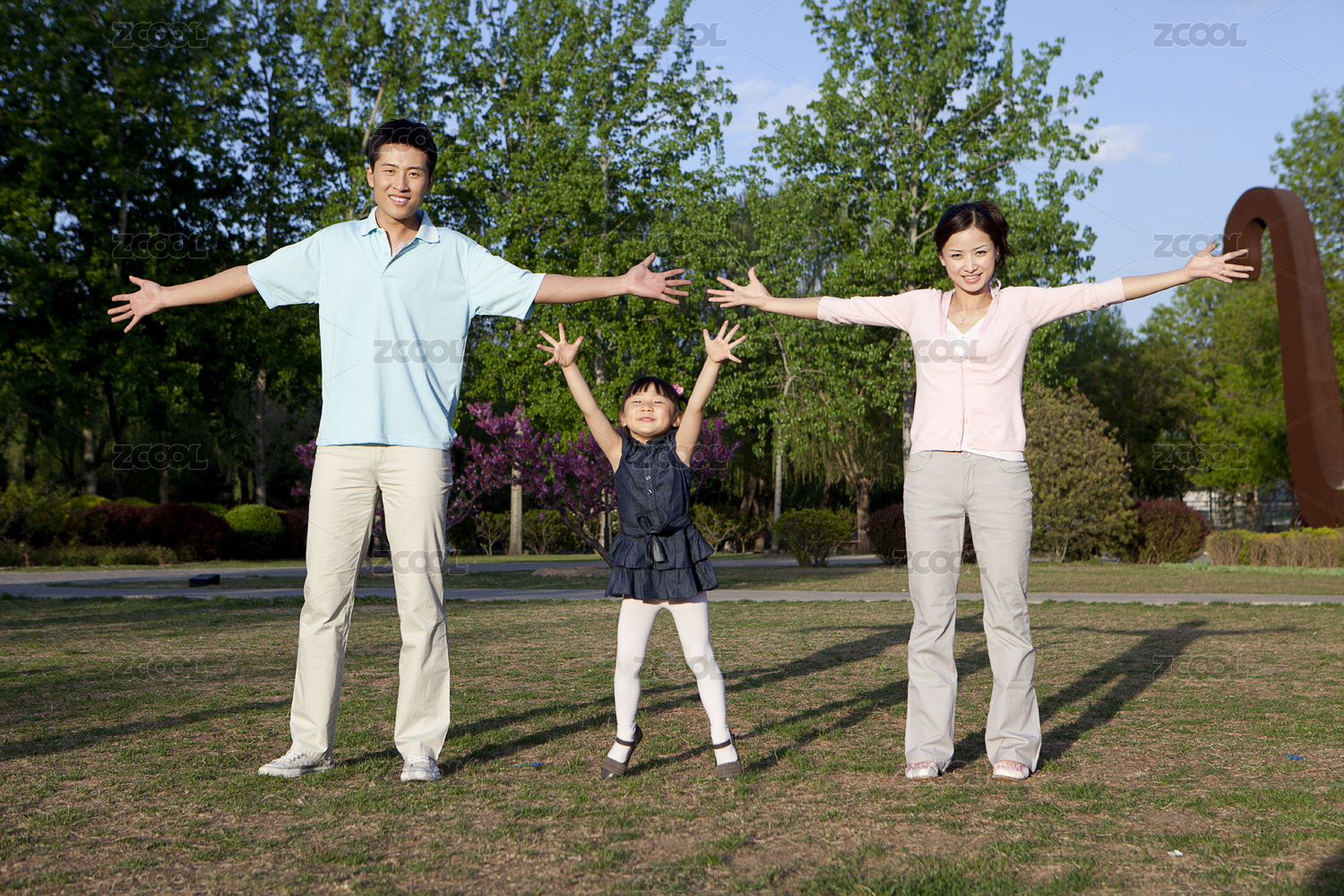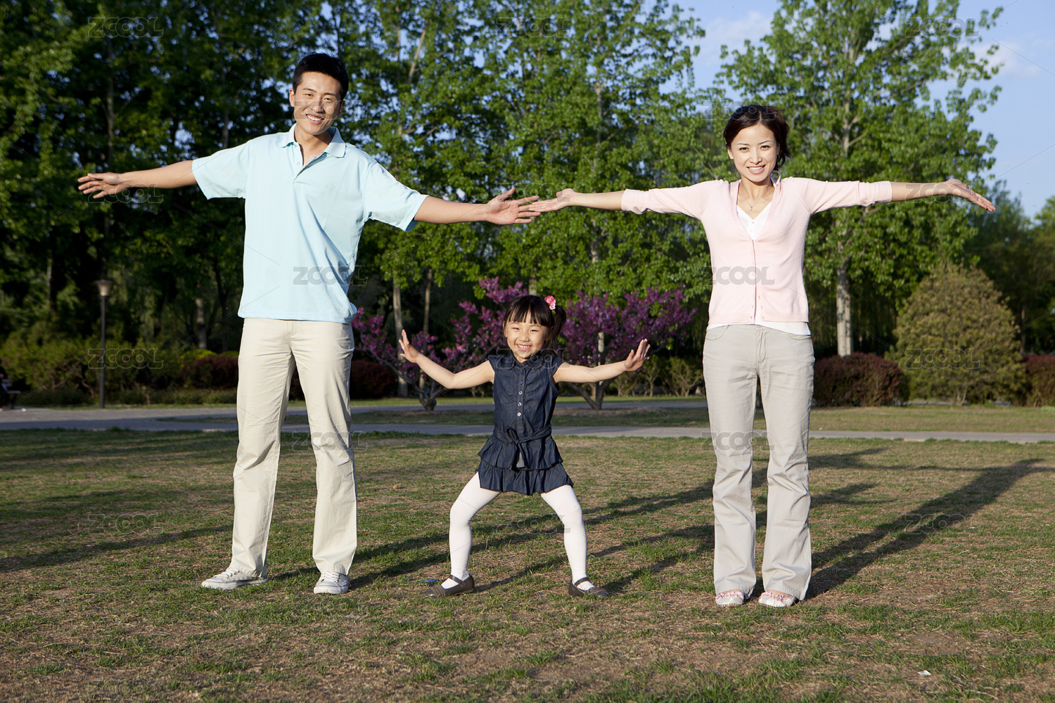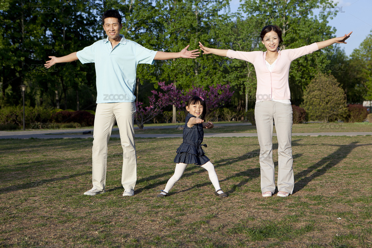 幸福的家庭在做有氧運(yùn)動(dòng)公園