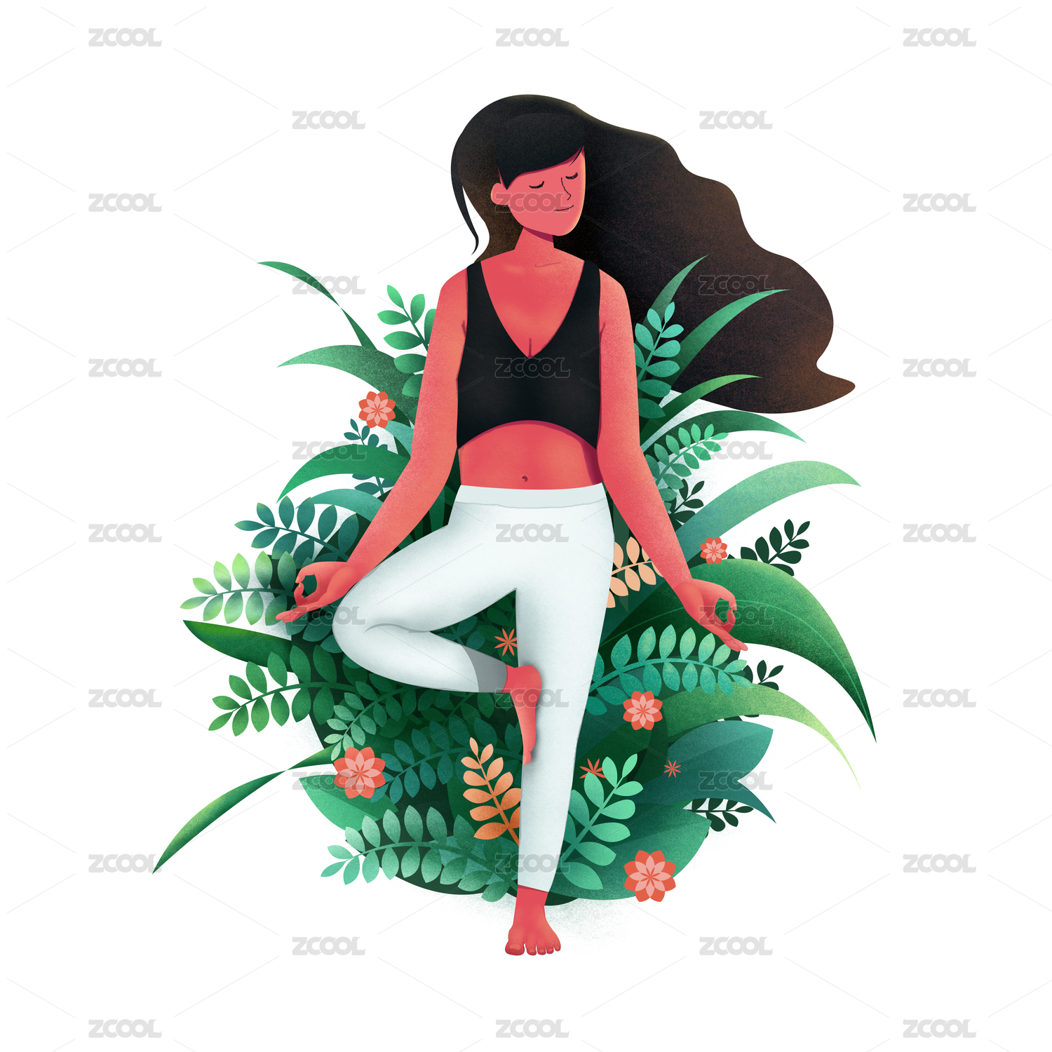 女孩在森林花海里做瑜伽有氧運(yùn)動(dòng)插畫