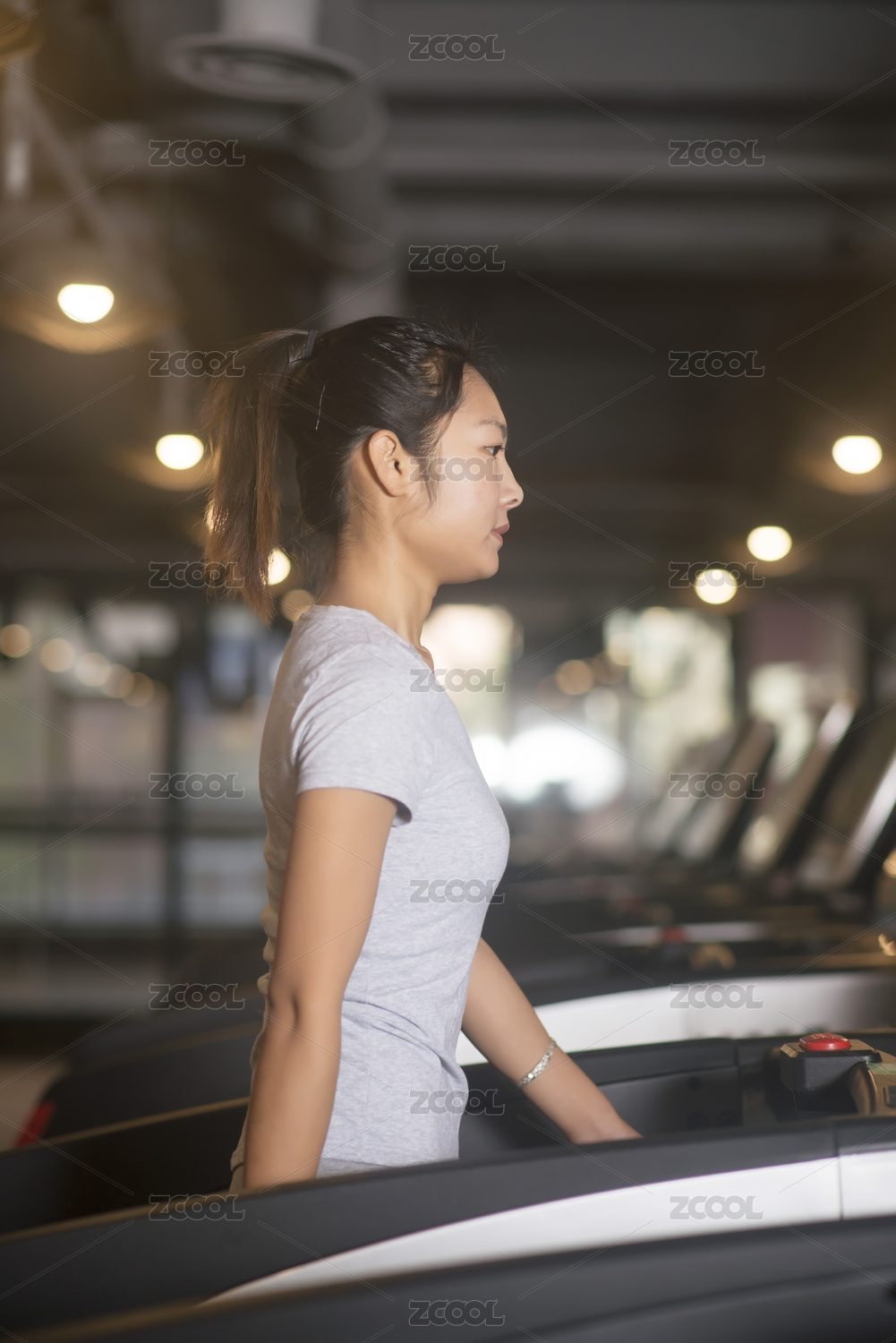 年輕女人在健身房跑步機(jī)上做有氧運(yùn)動(dòng)