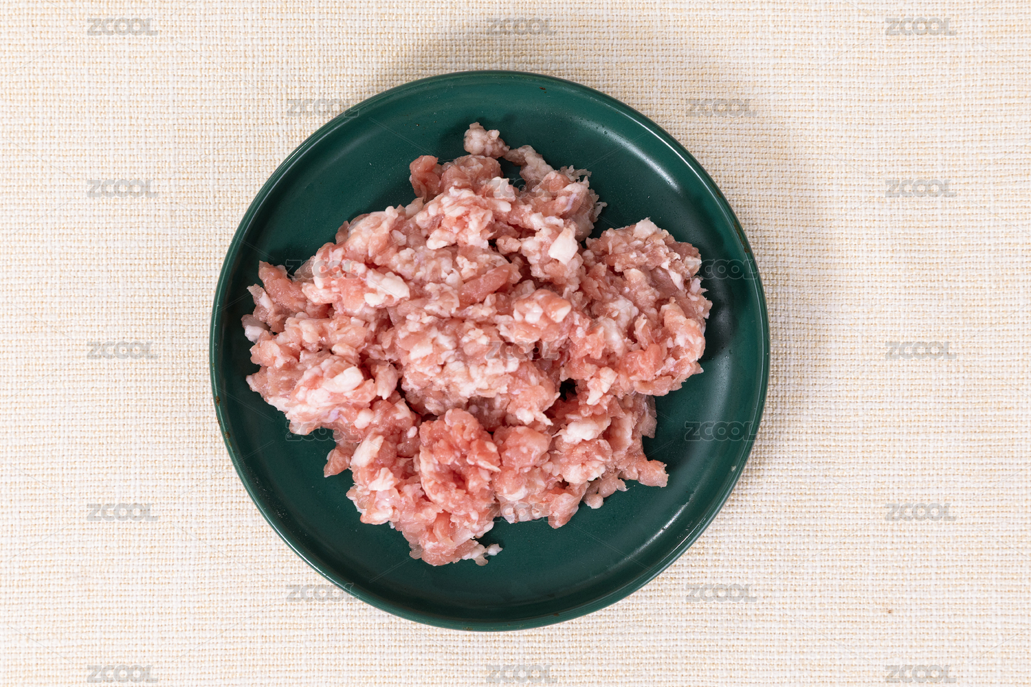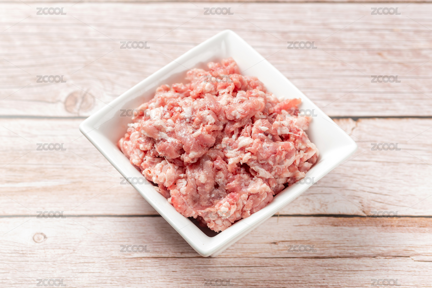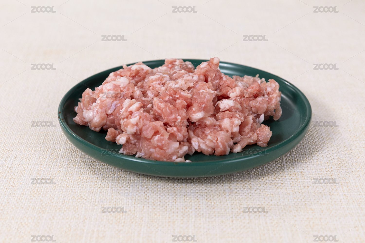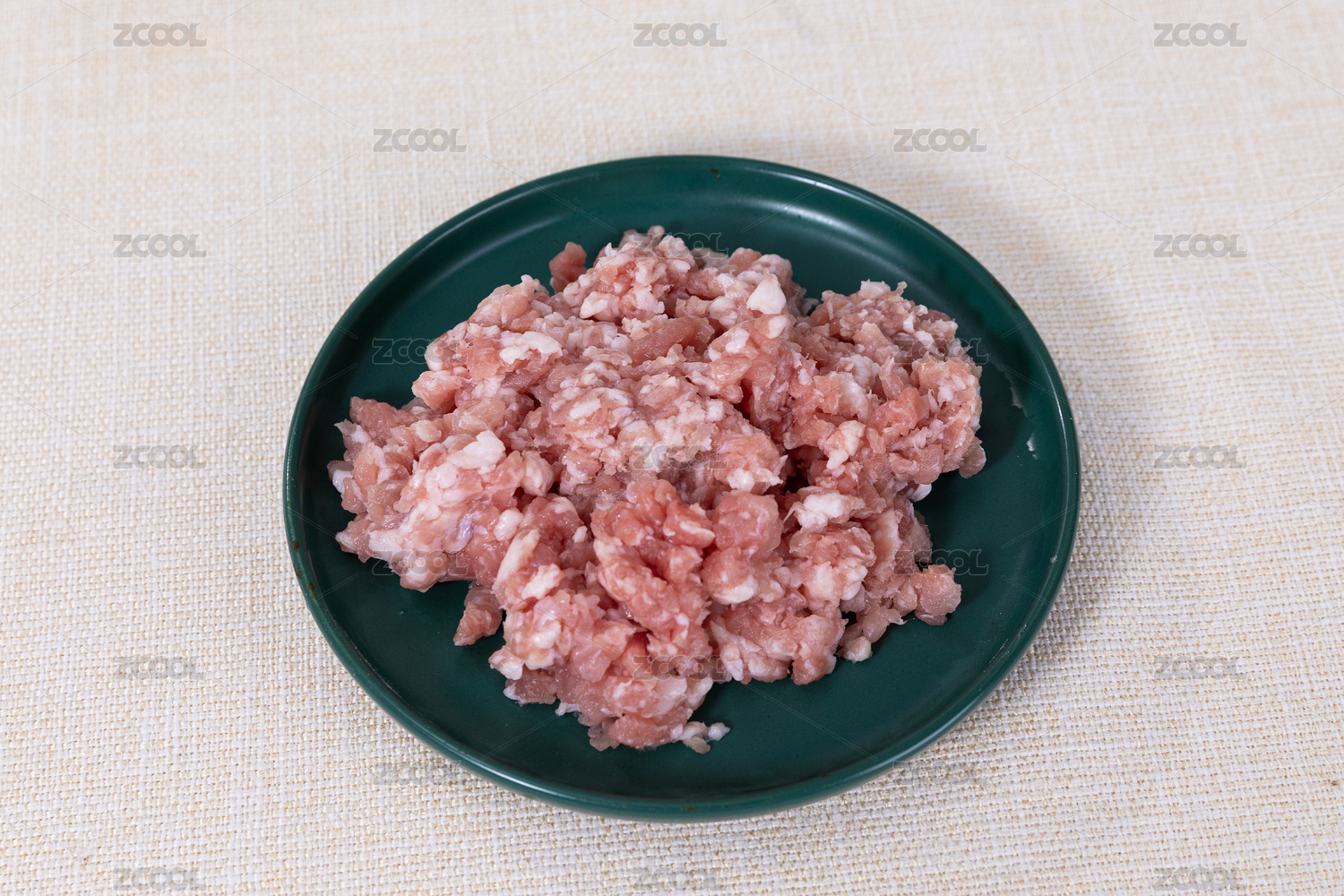 紅色桌面上的一盤子新鮮食材豬肉餡肉末
