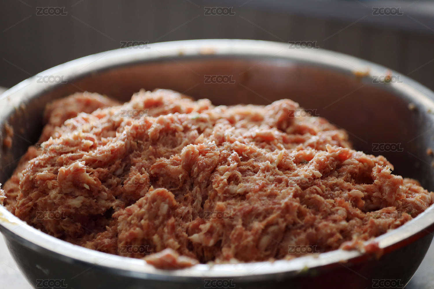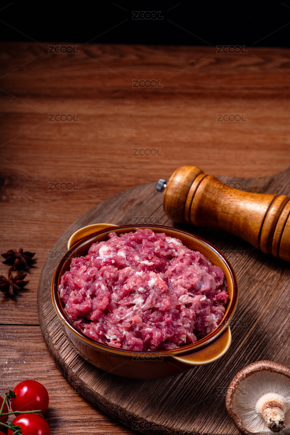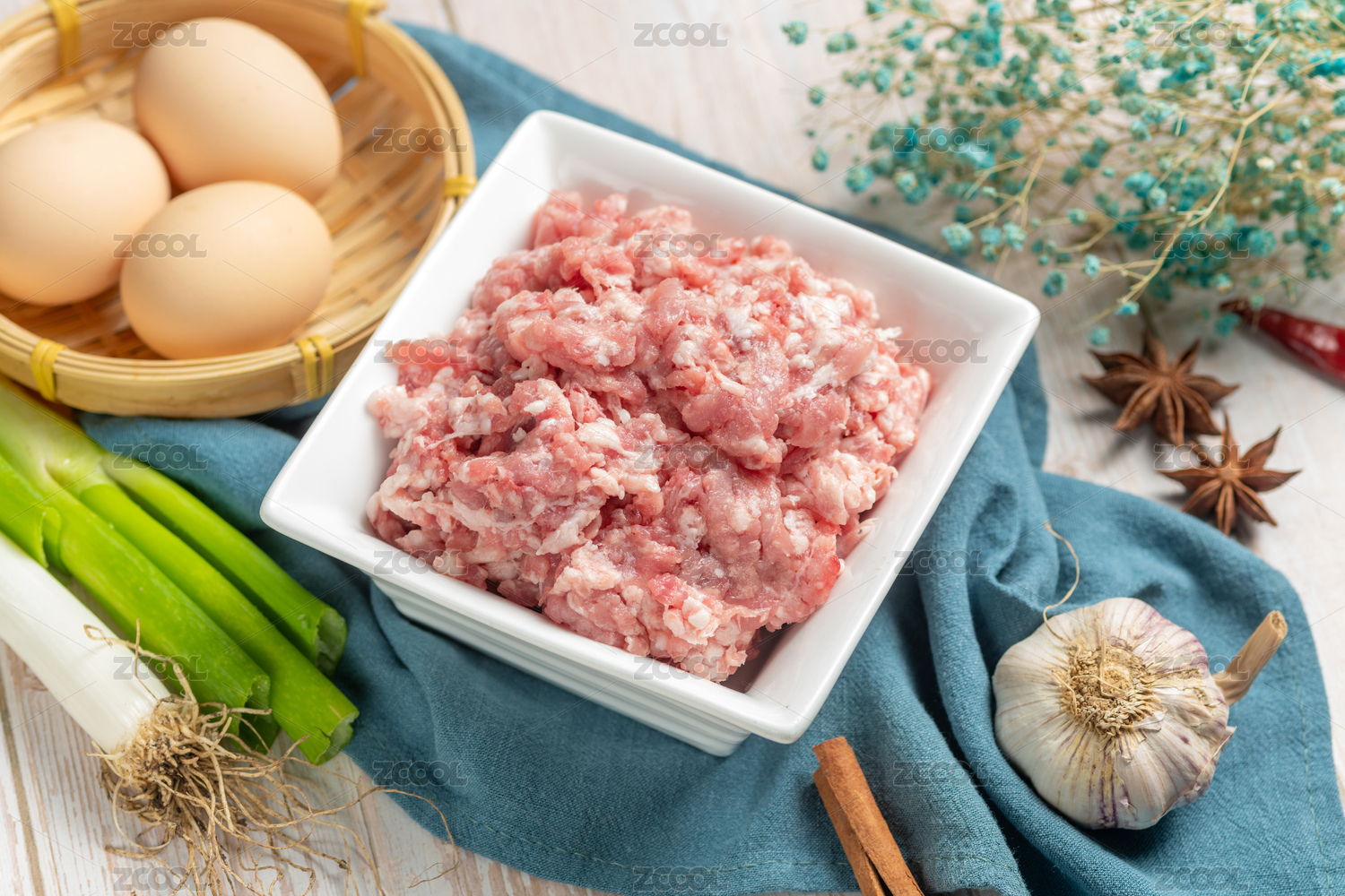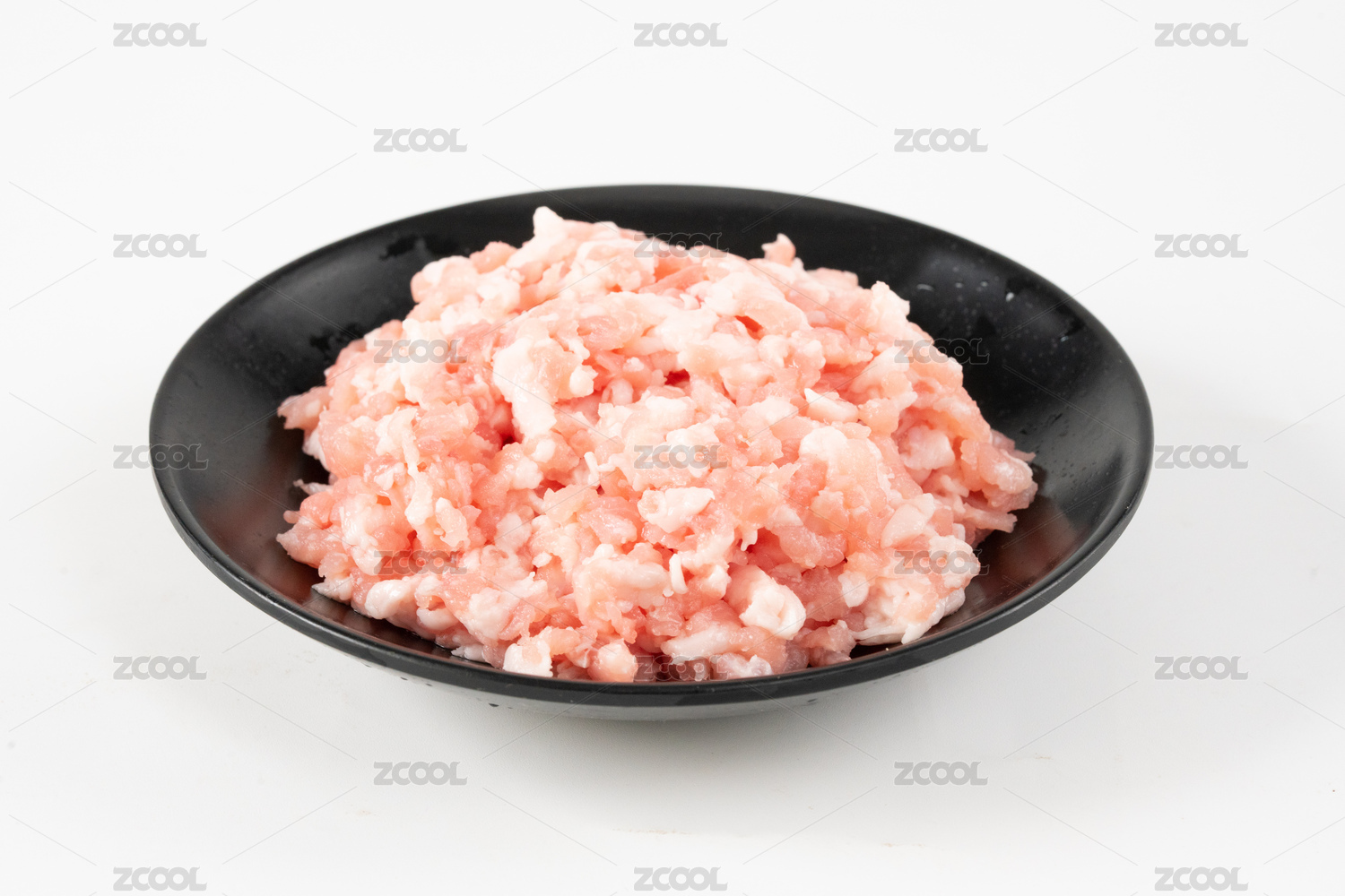 紅色桌面上的一盤子新鮮食材豬肉餡肉末