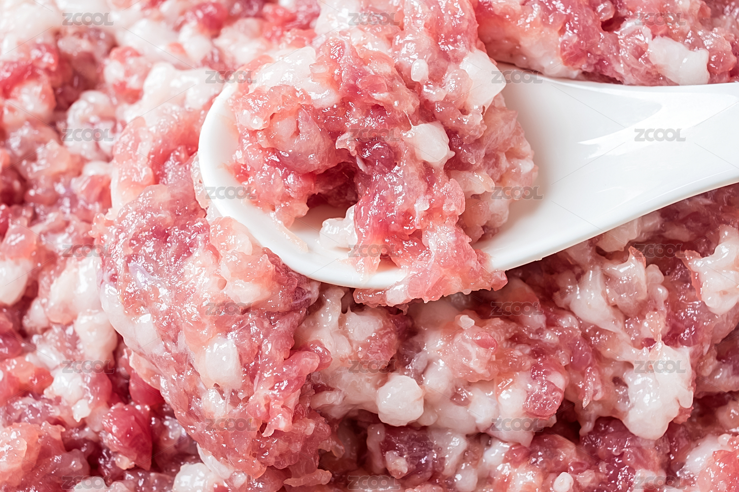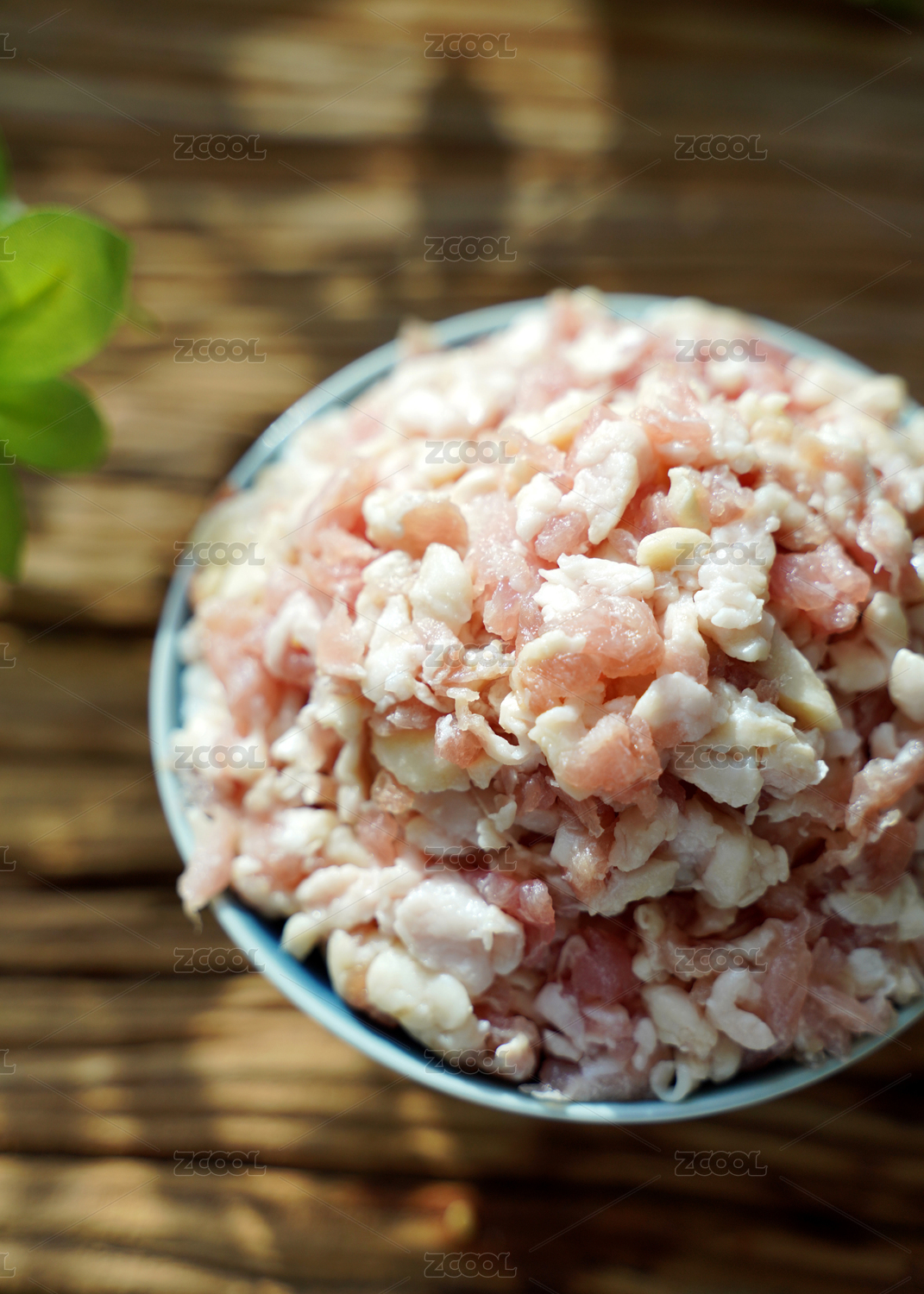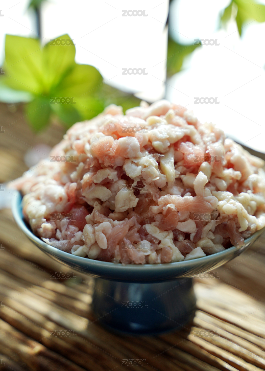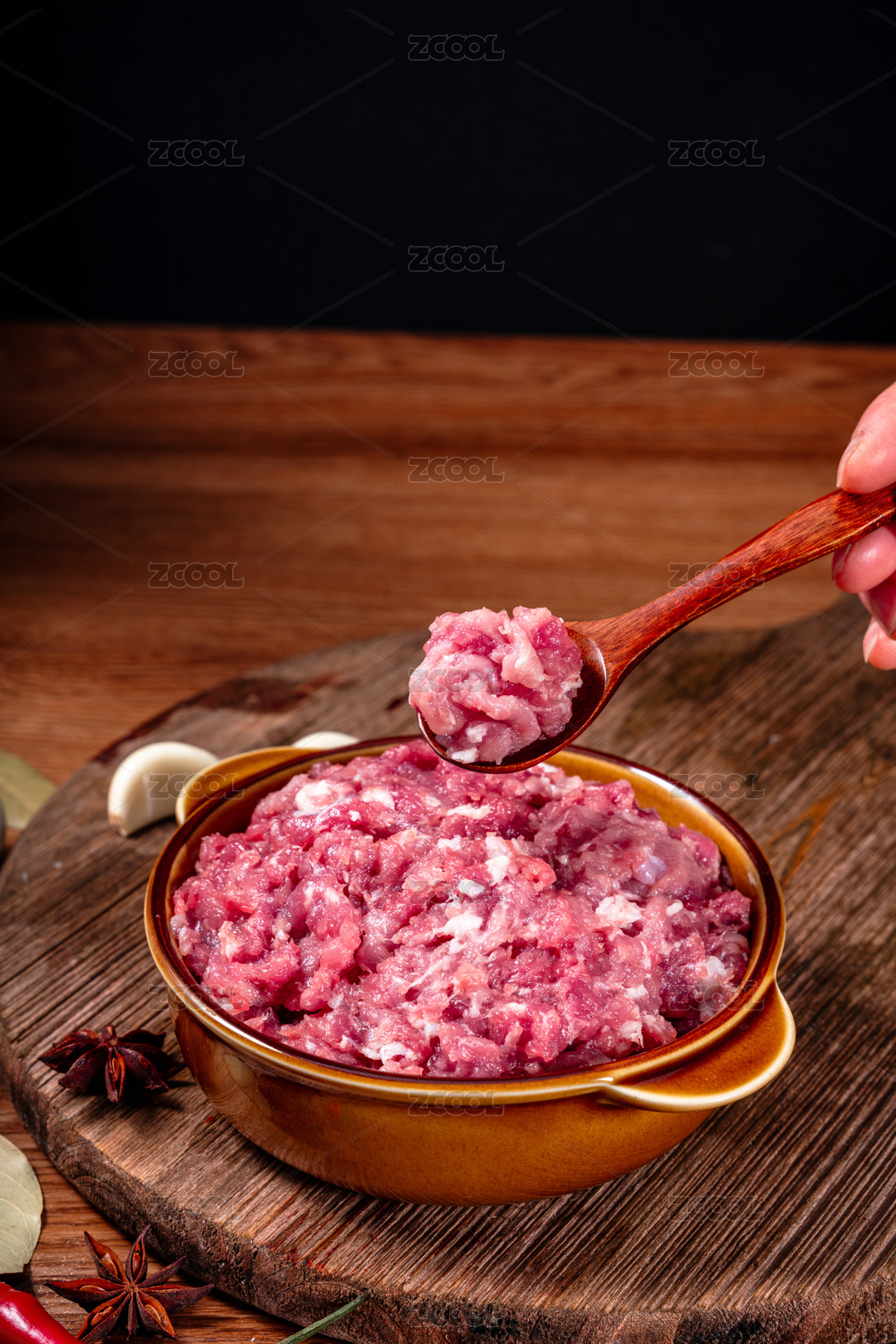 紅色桌面上的一盤子新鮮食材豬肉餡肉末