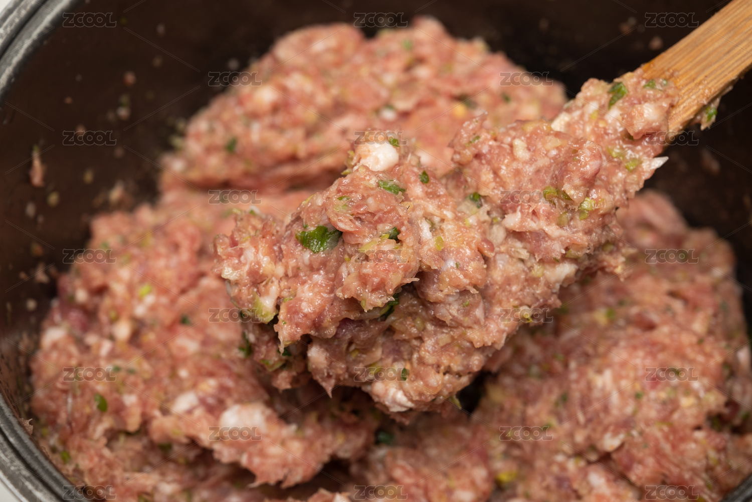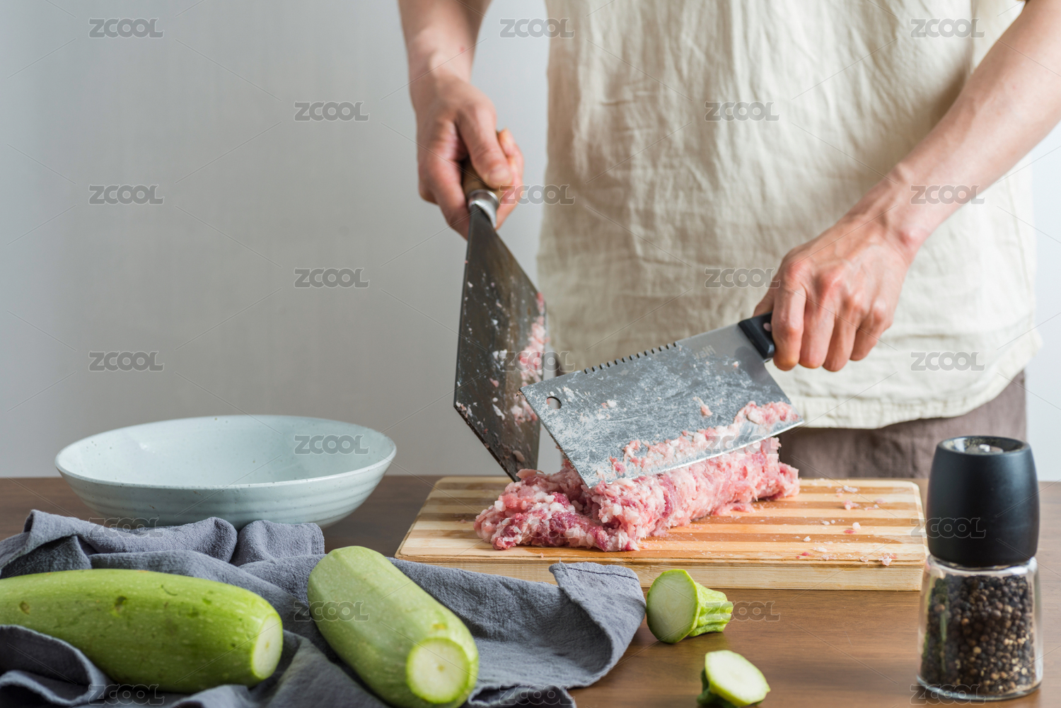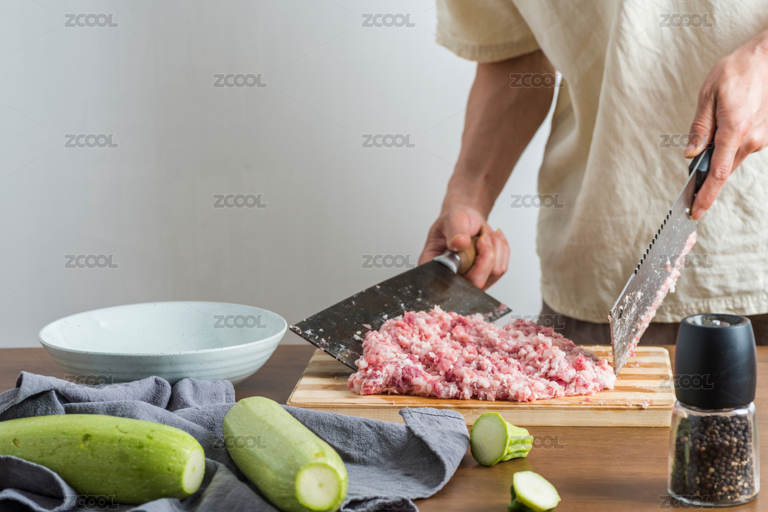 制作肉餡的桌面上放著絞肉機(jī)和面粉碎菜料理機(jī)