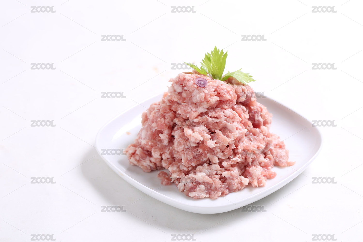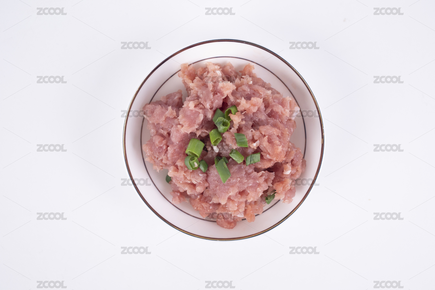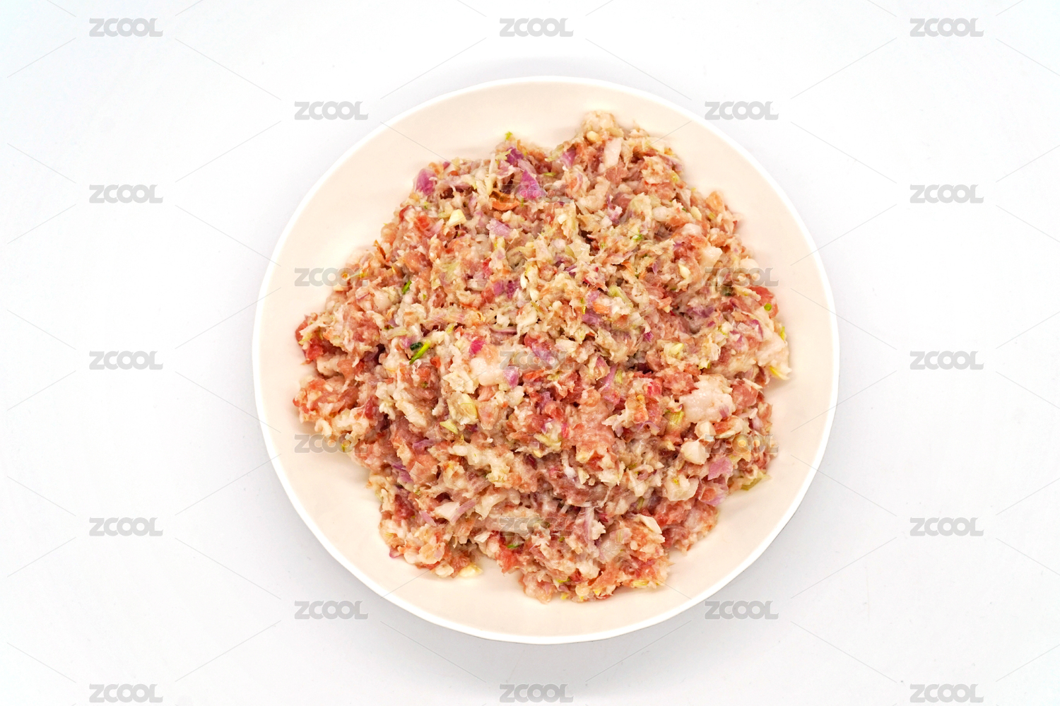 一盤子新鮮食材豬肉餡餃子餡特寫的白底圖