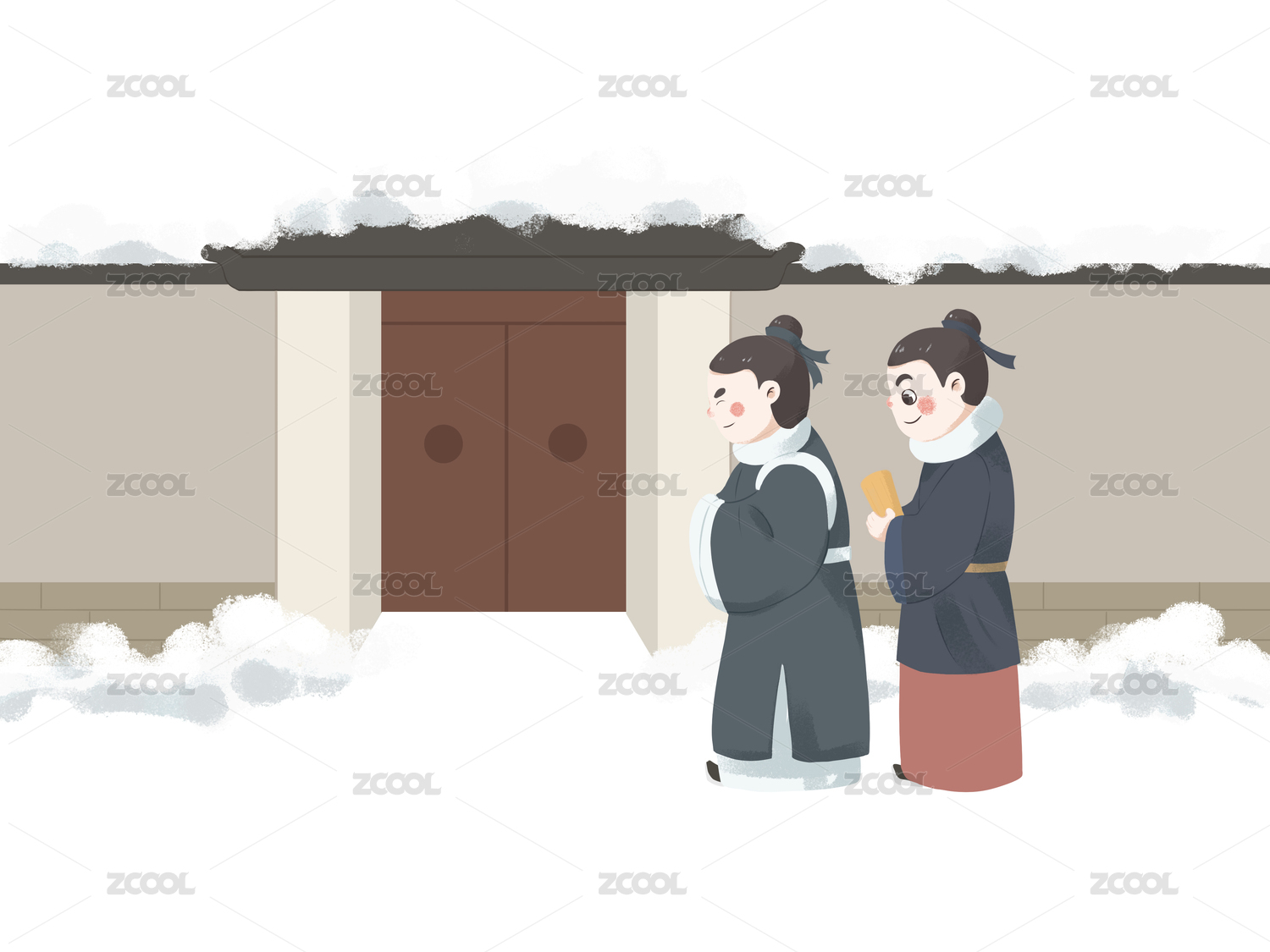 成語(yǔ)故事下雪天古裝人物門外站立