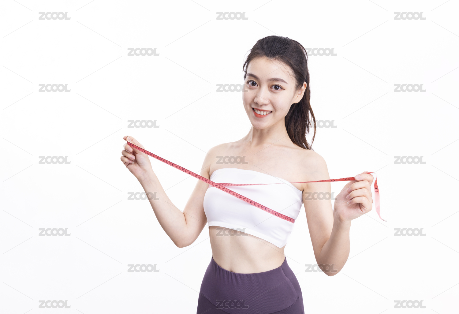 穿著白色運動內(nèi)衣的魅力女性在測量胸部