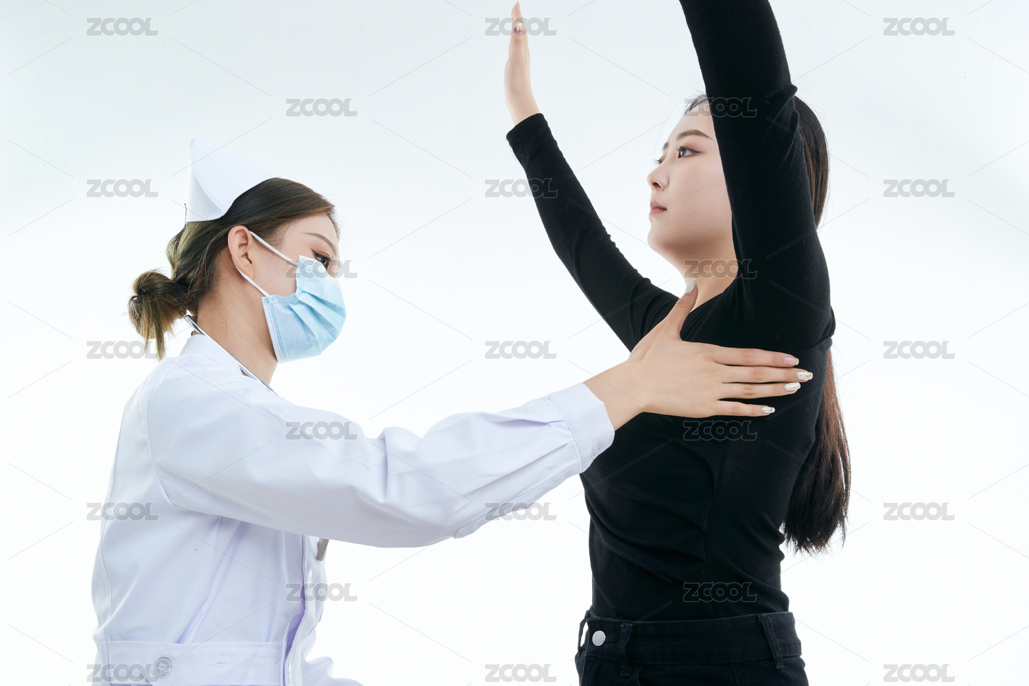 年輕的女性醫(yī)護人員為患者進行胸部檢查