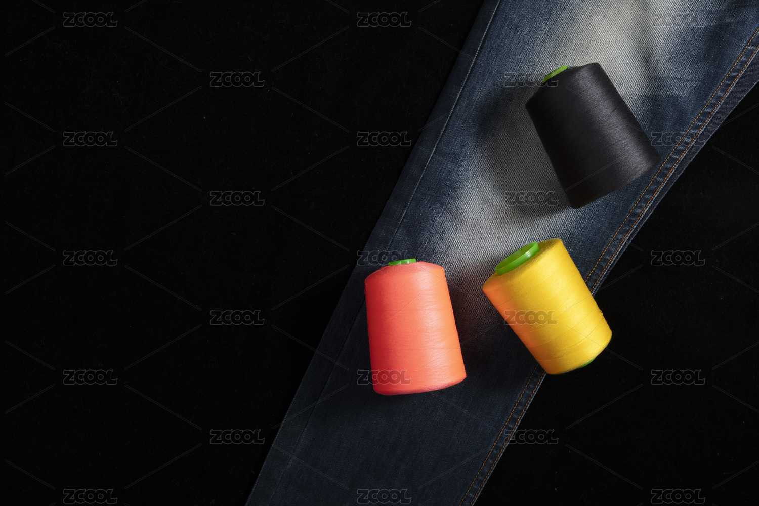黑色背景牛仔褲與三種顏色的線團(tuán)