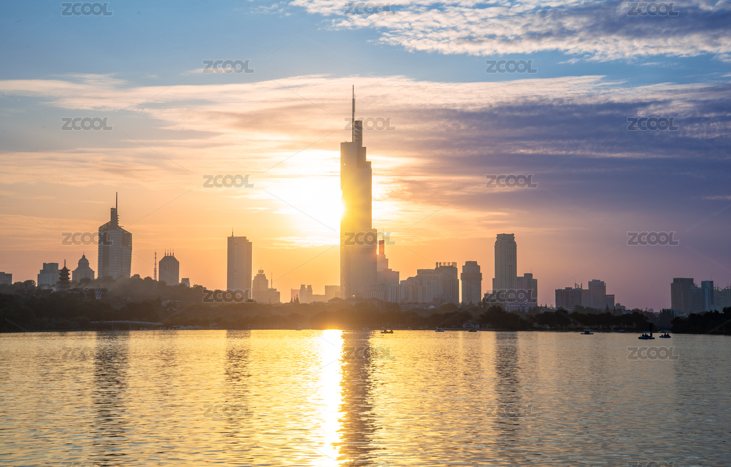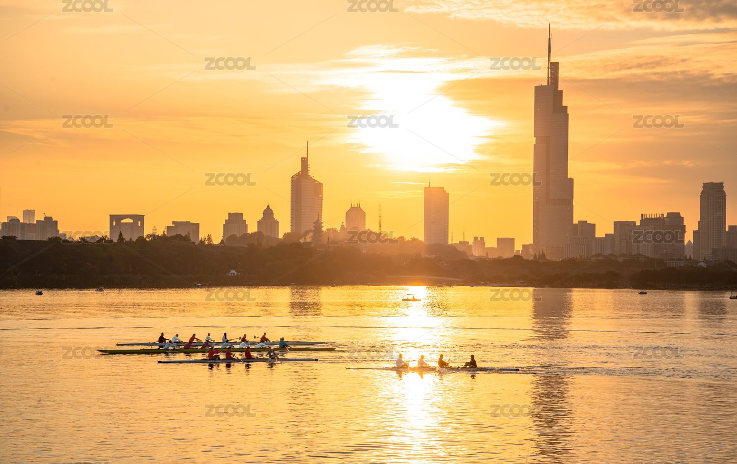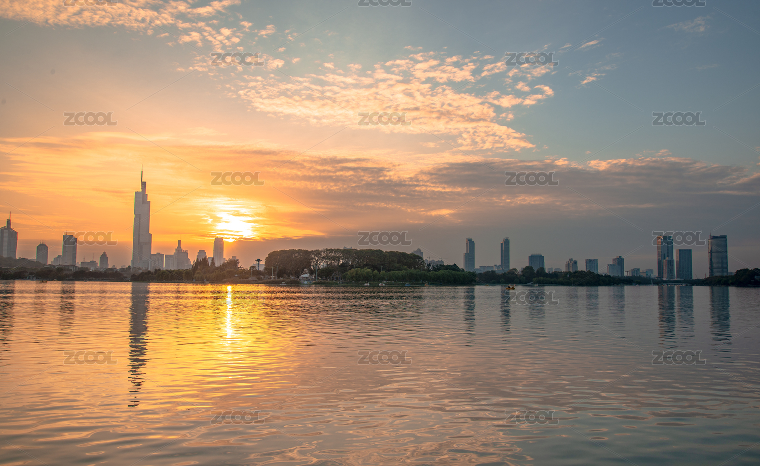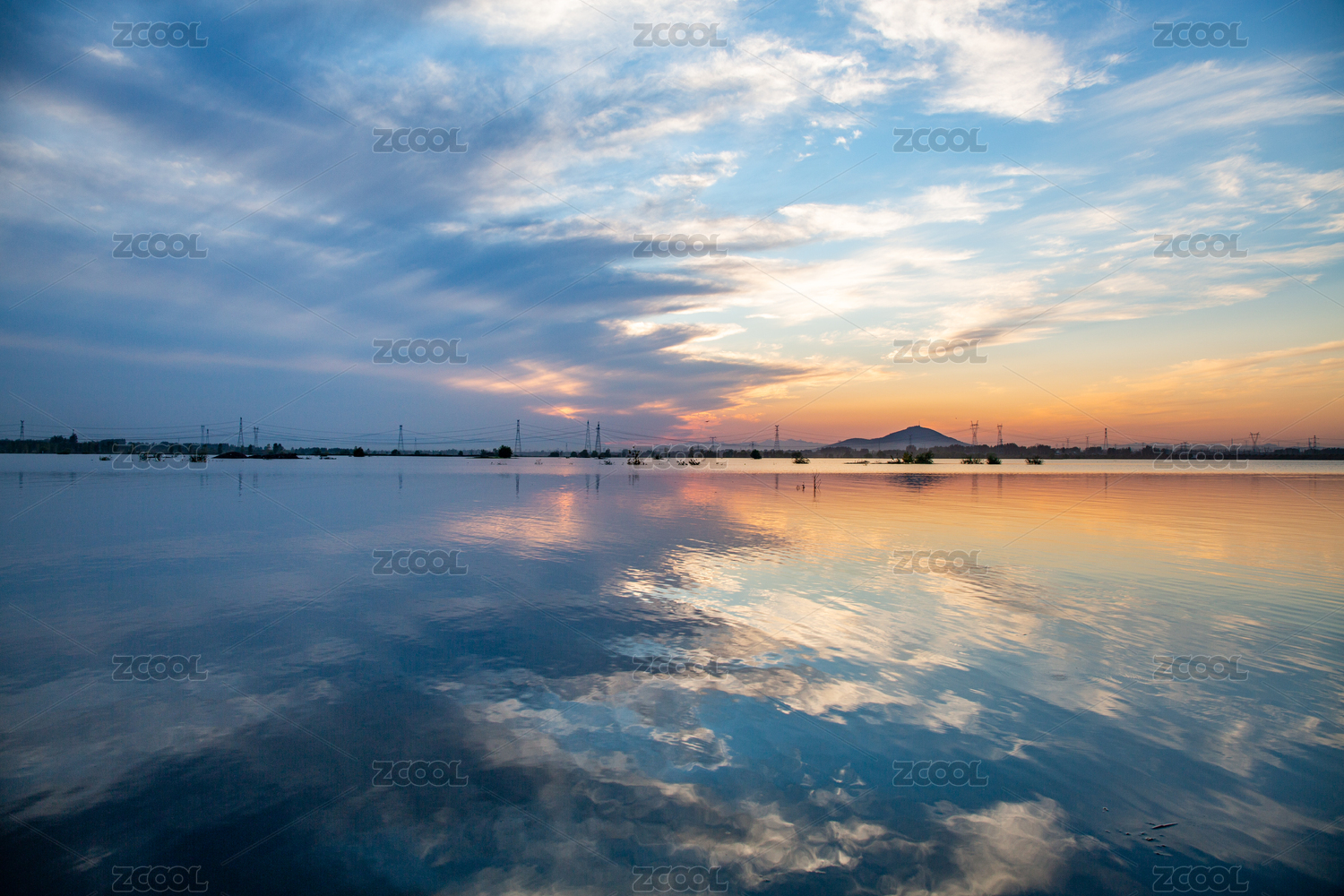日落時(shí)分夕陽染紅天空在湖面倒影水天一色