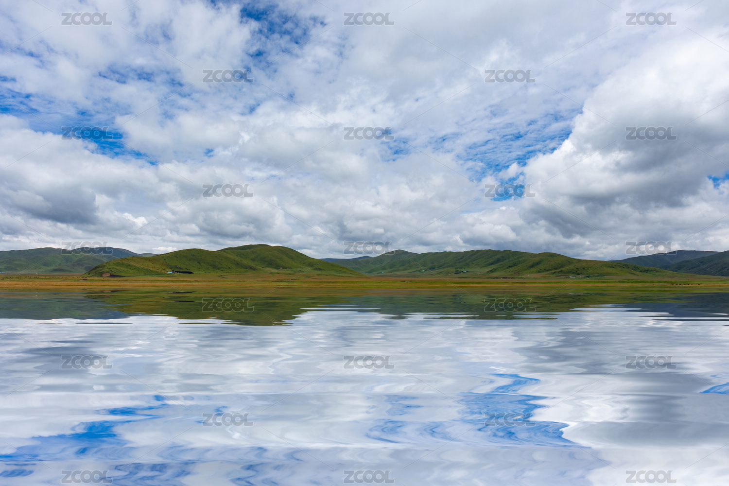 藍(lán)天白云青山在平靜湖面倒影水天一色