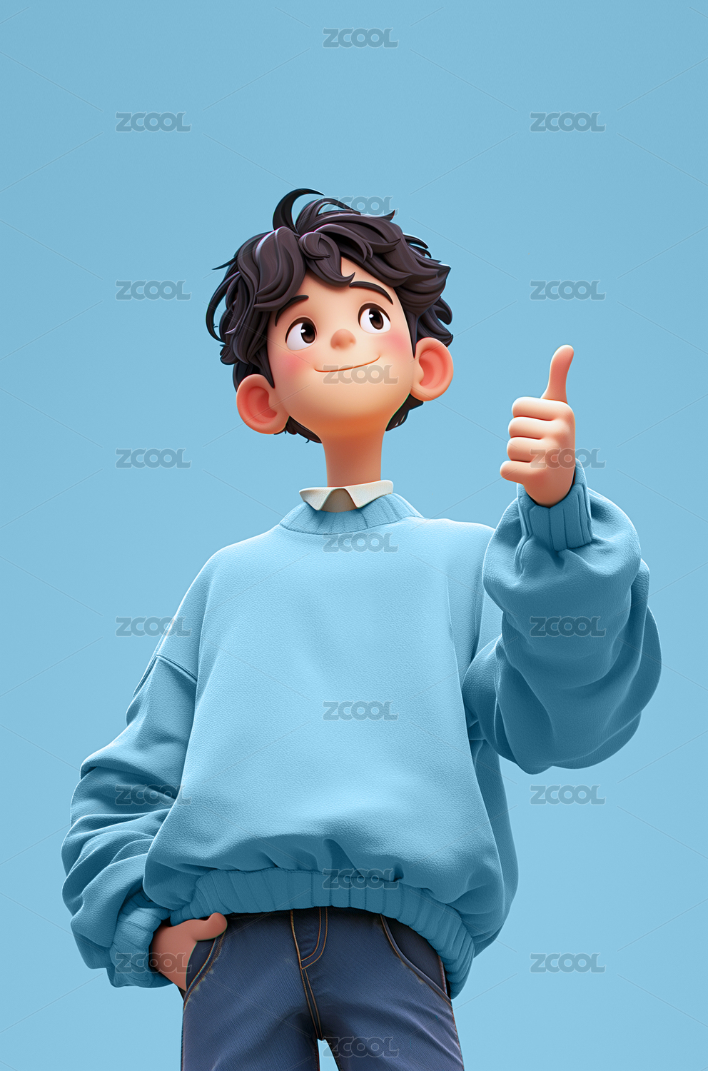 3d 男孩舉起大拇指在純色背景上點(diǎn)贊