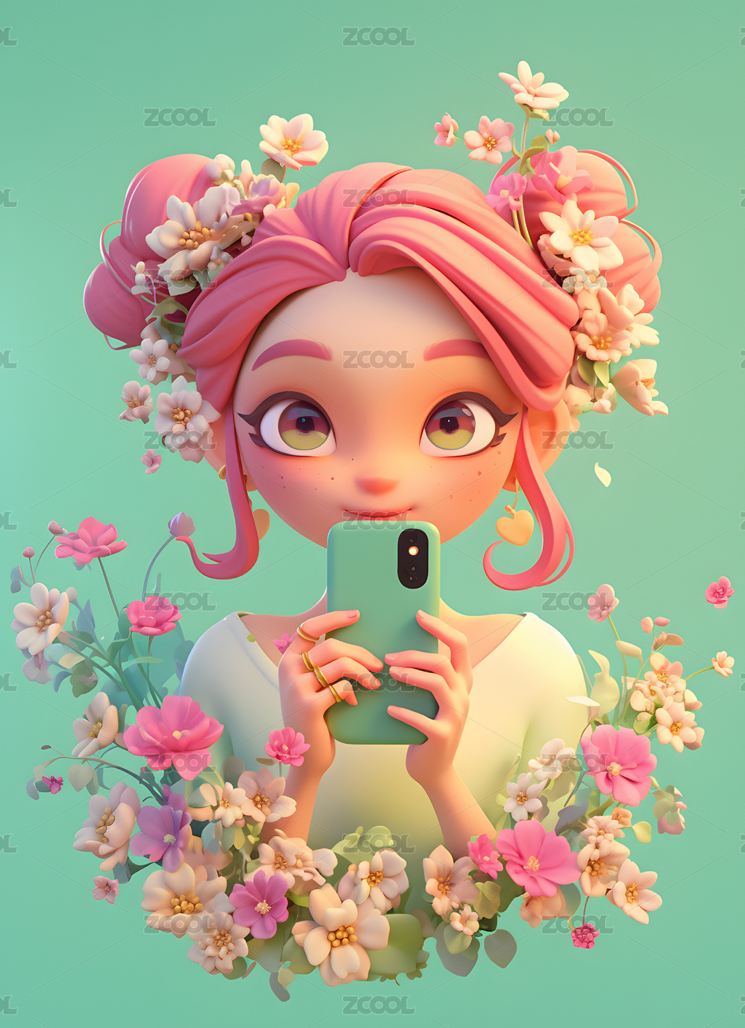 3D卡通女孩在植物花朵中拿著手機(jī)