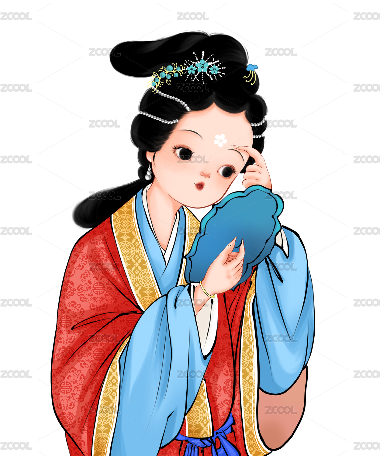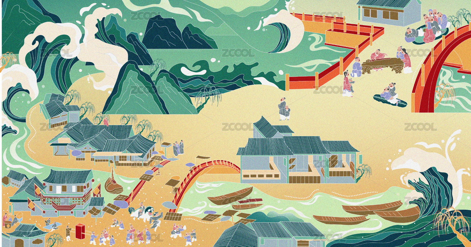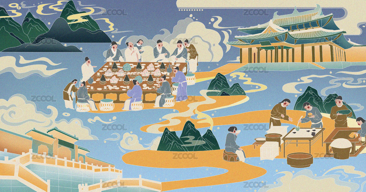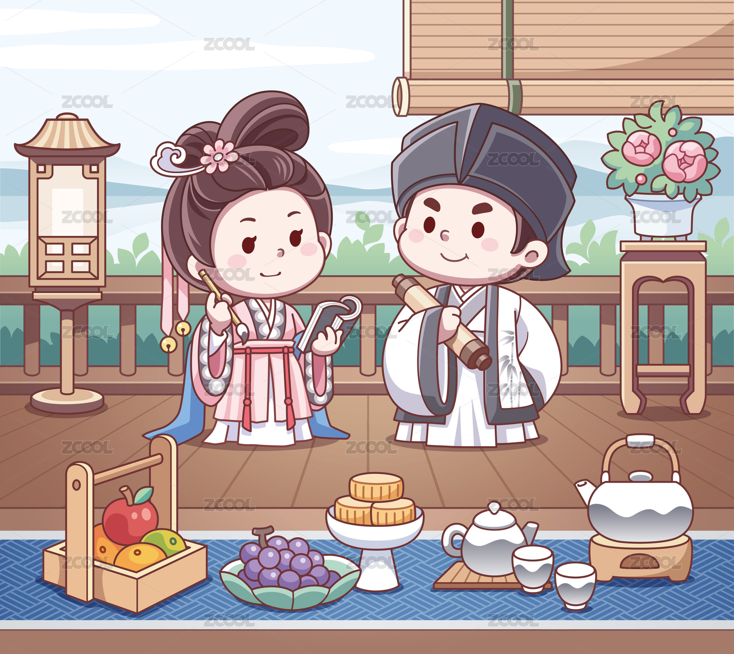 卡通宋朝才子佳人湖邊茶話會(huì)矢量圖