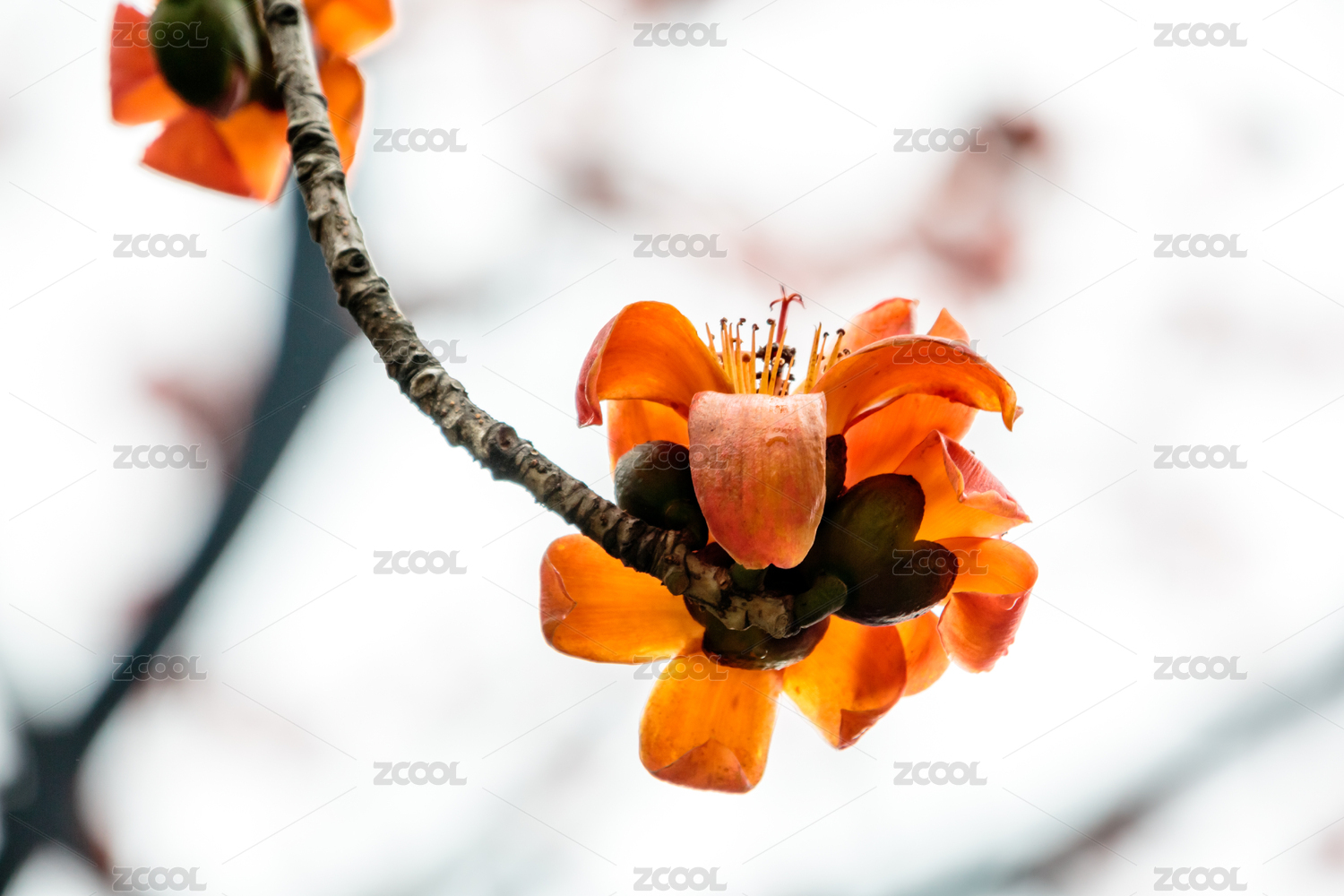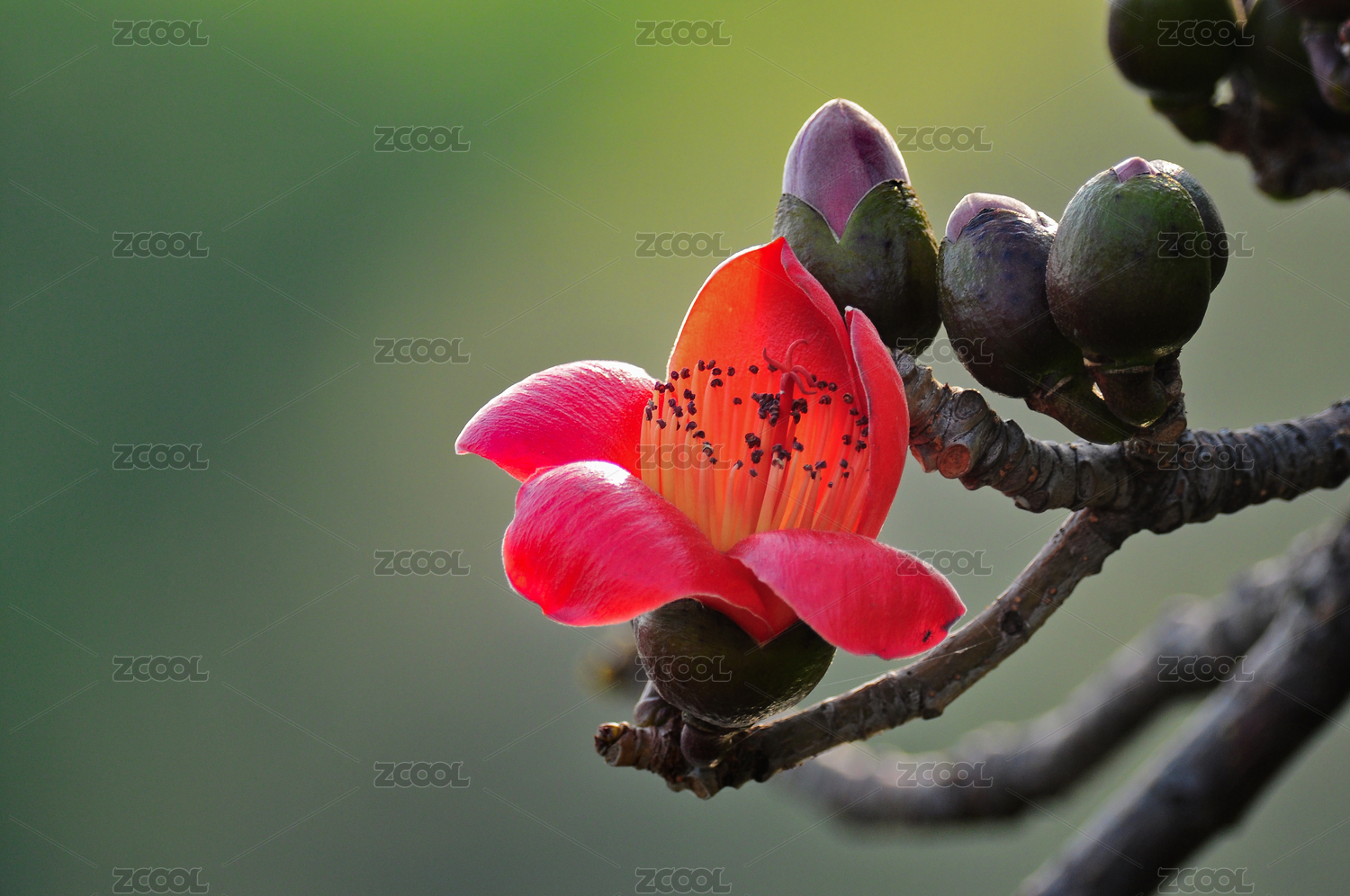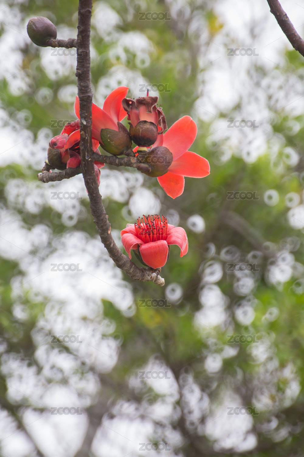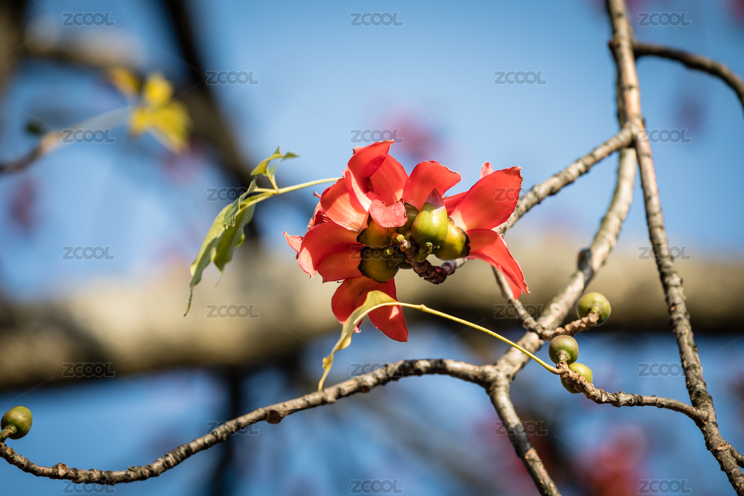 樹(shù)上一朵盛開(kāi)的紅色木棉花和幾個(gè)花蕾