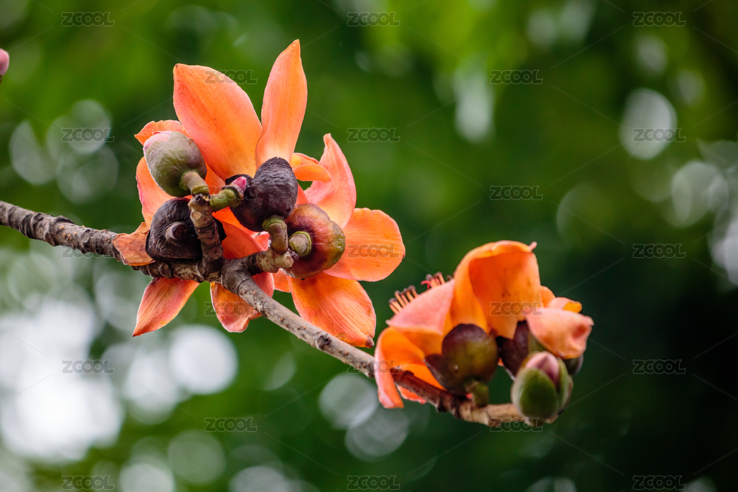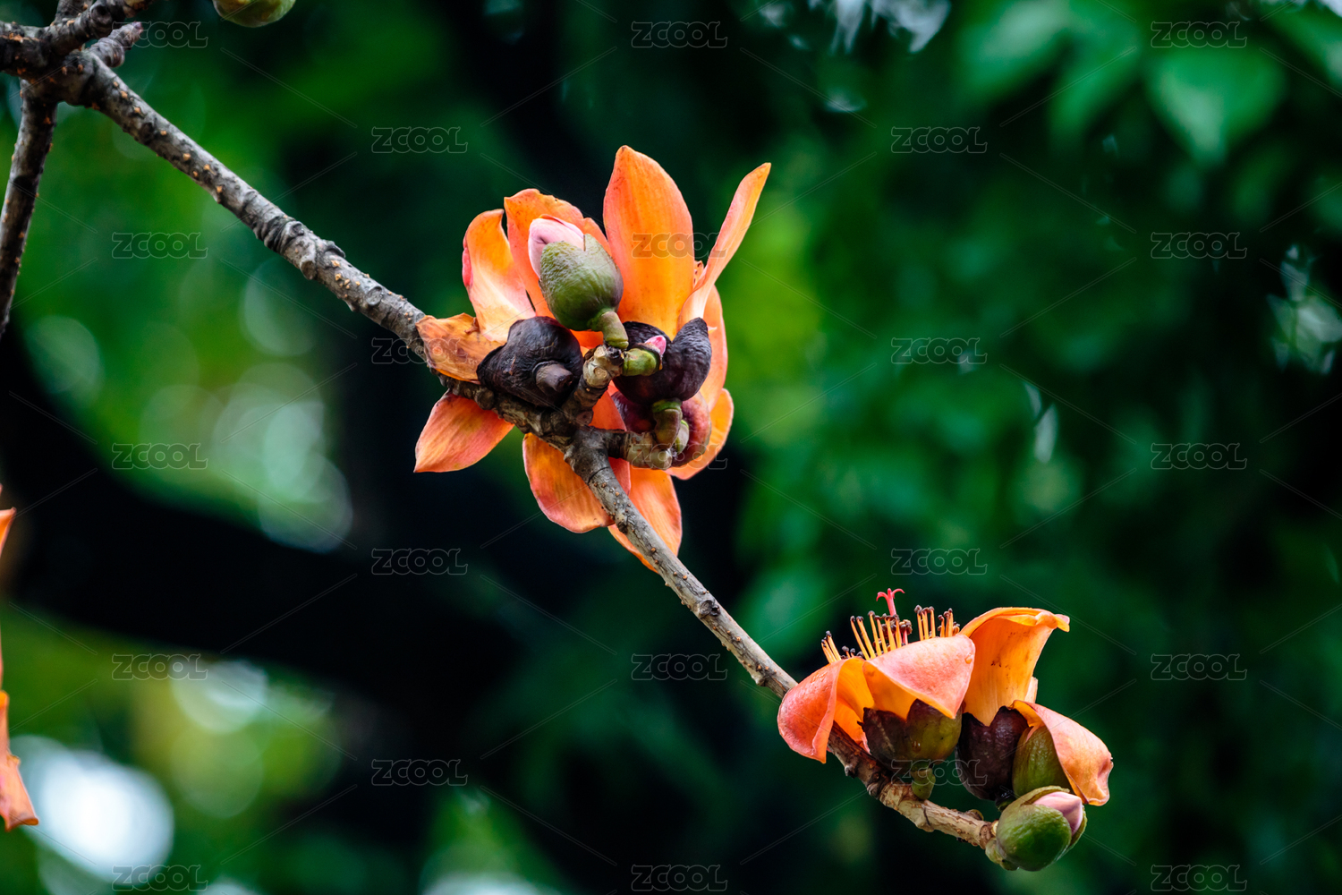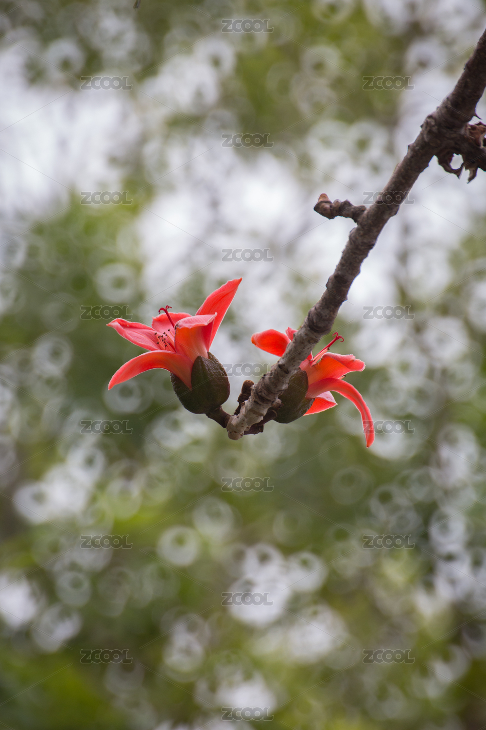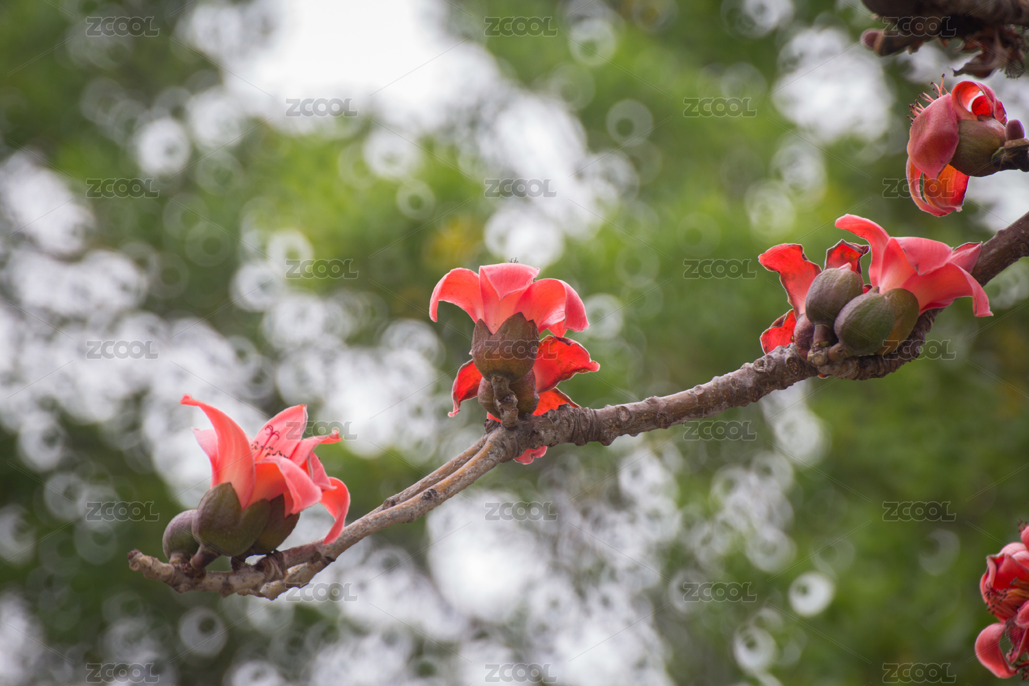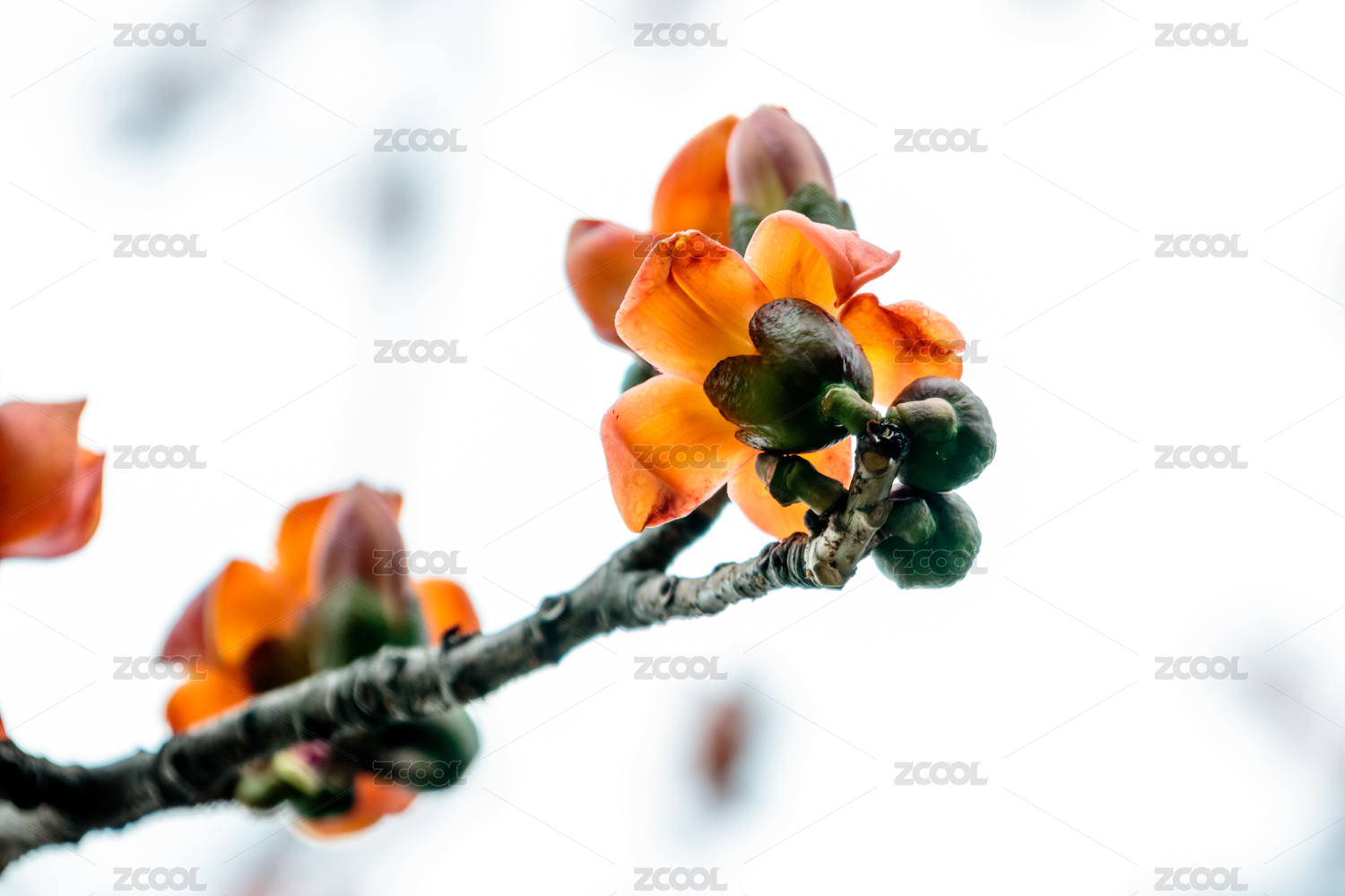 樹(shù)上一朵盛開(kāi)的紅色木棉花和幾個(gè)花蕾