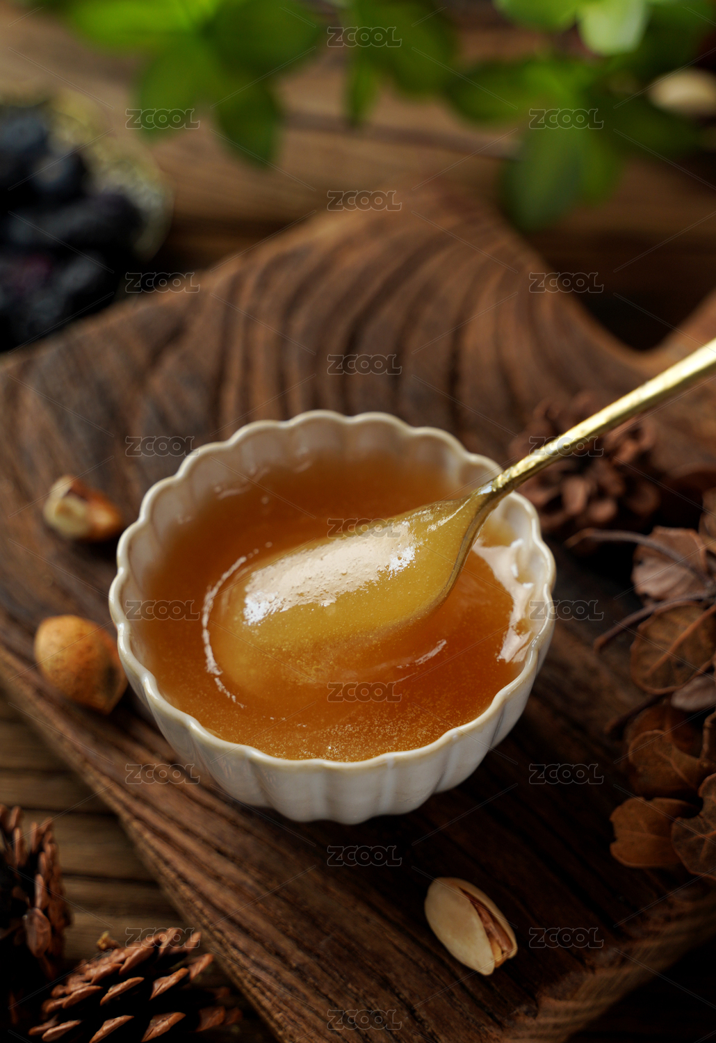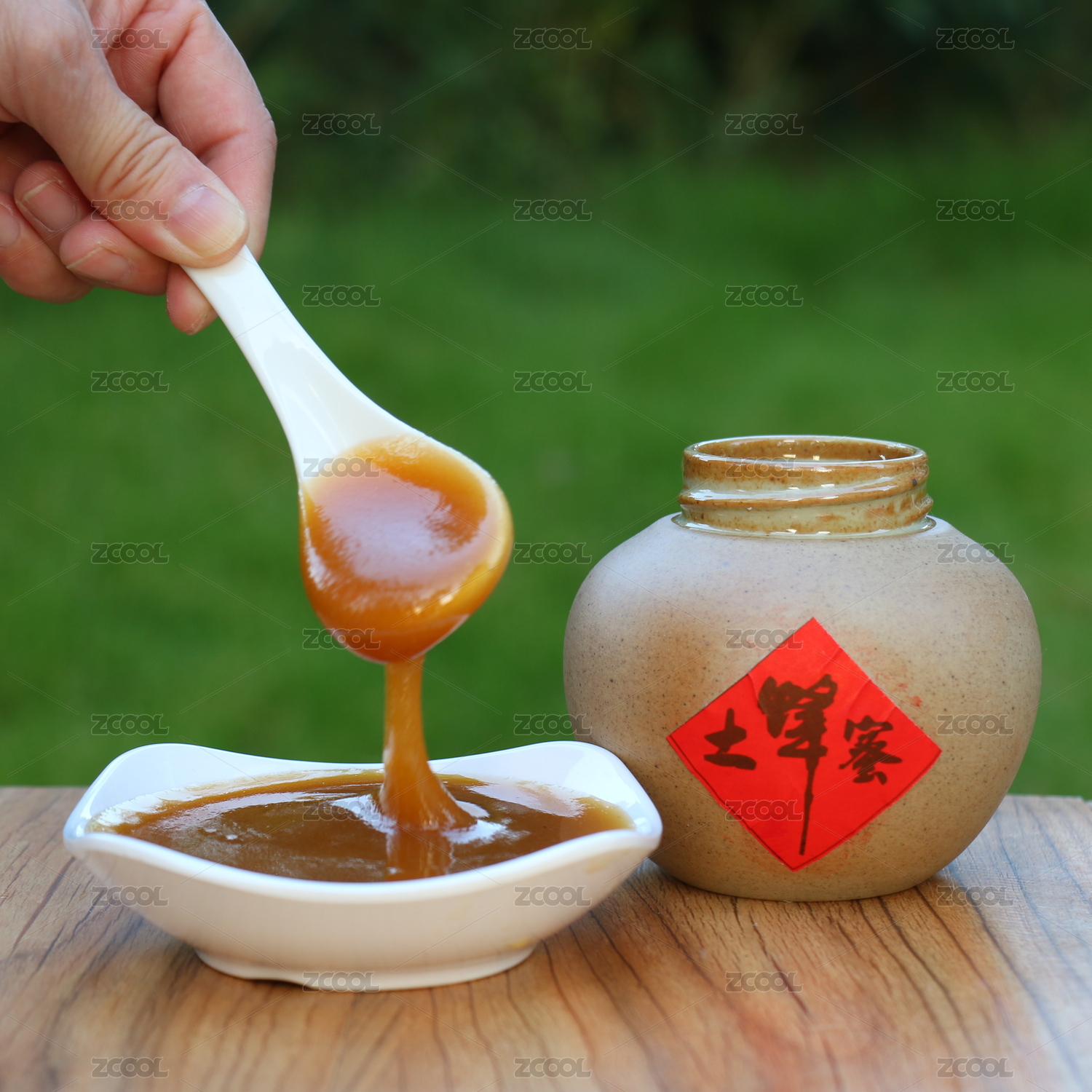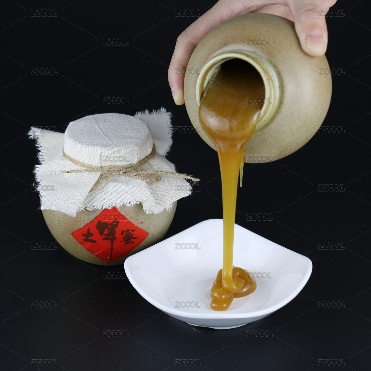 黑底圖放在古樸瓦罐里的土蜂蜜緩慢倒出