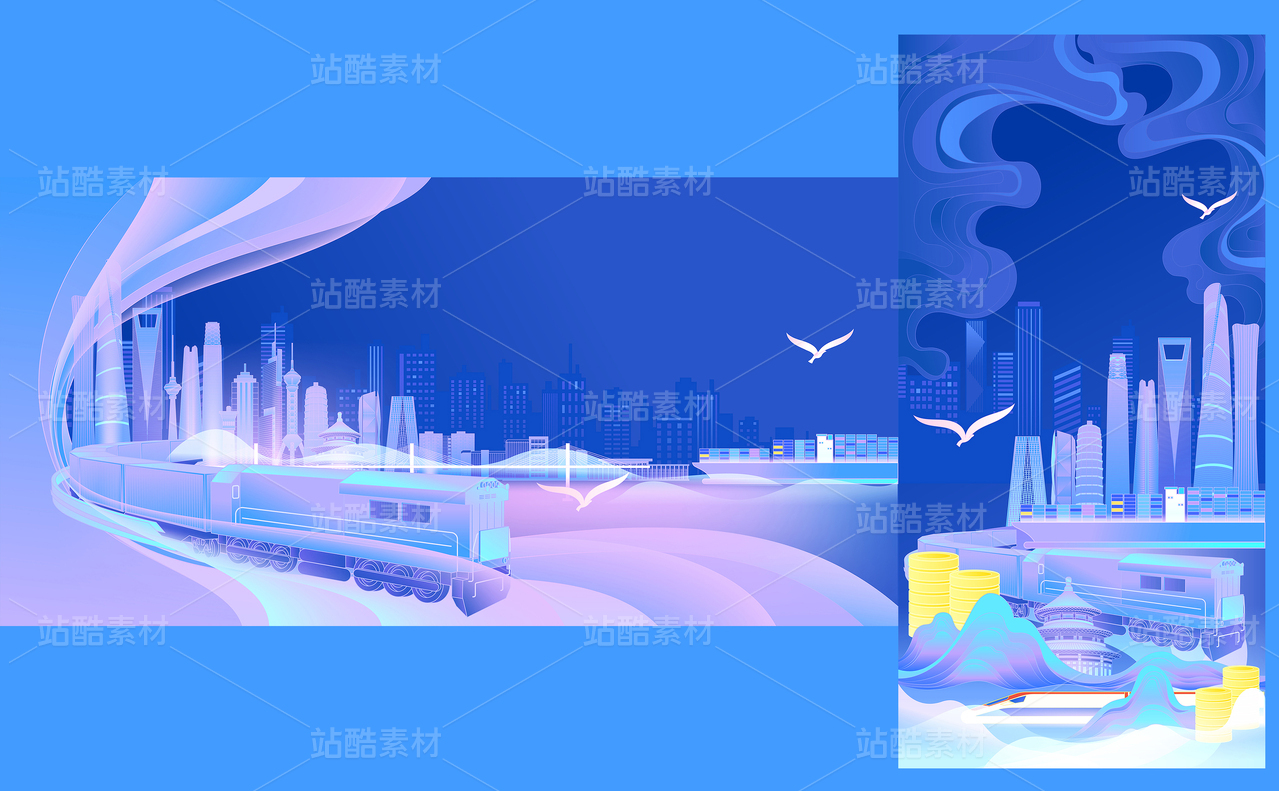 一帶一路合作共榮能源建筑列車金融發(fā)展橫版和豎版插畫