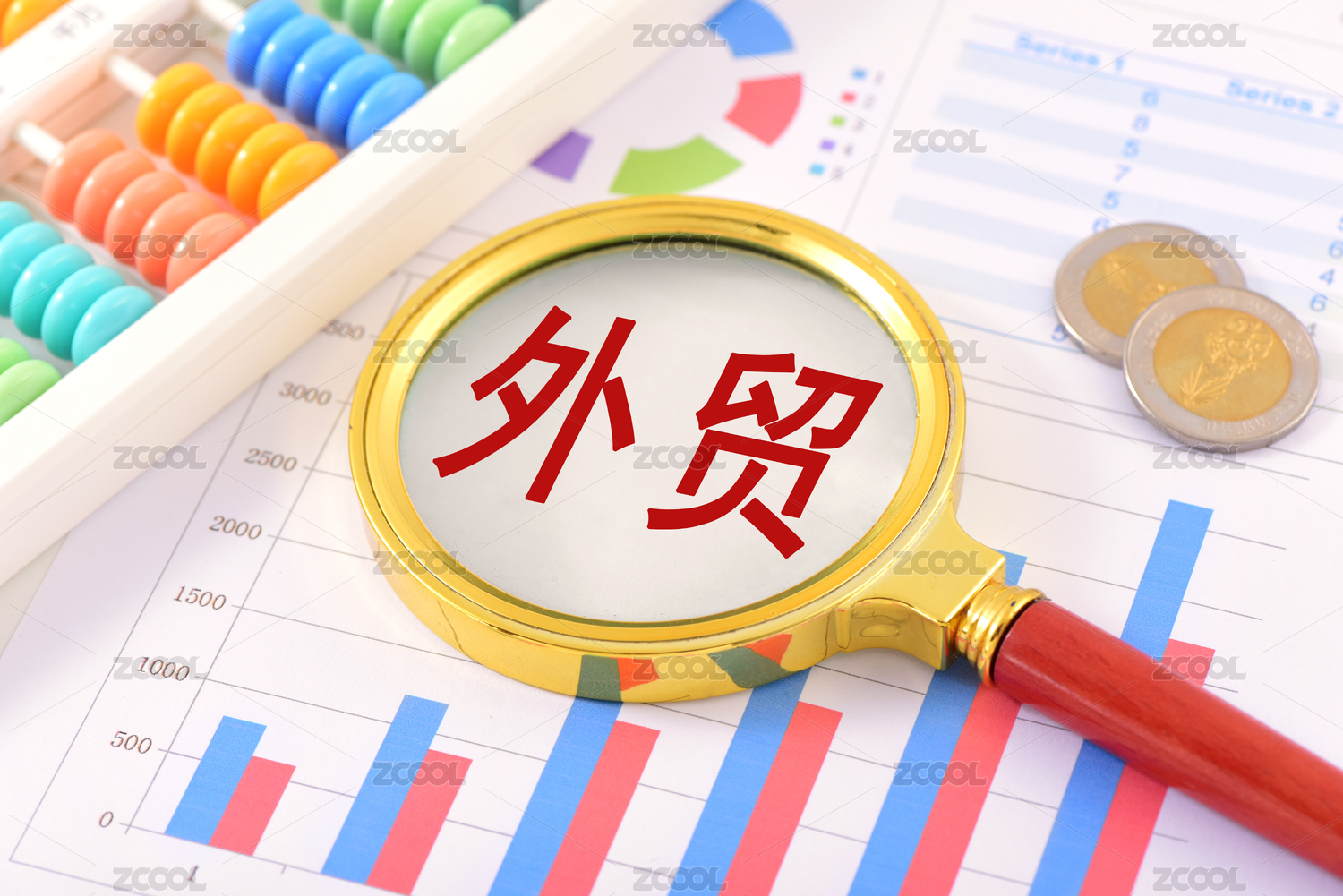 數(shù)據(jù)圖表上的放大鏡印著文字外貿(mào)