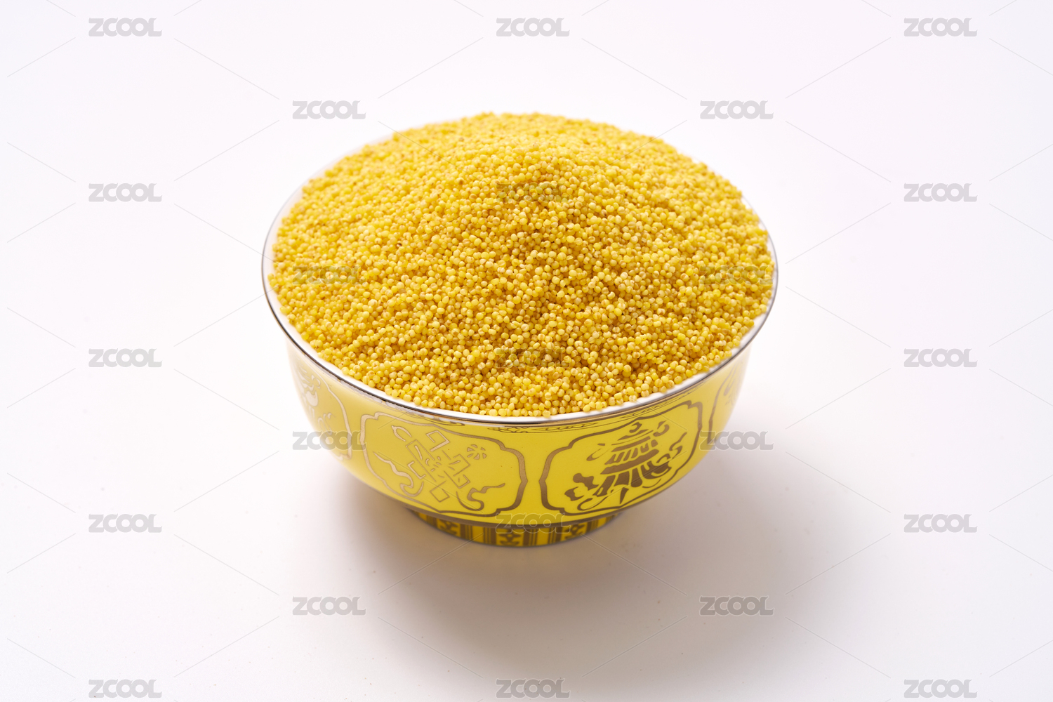 一個黃色的碗盛裝著黃小米在白色背景中