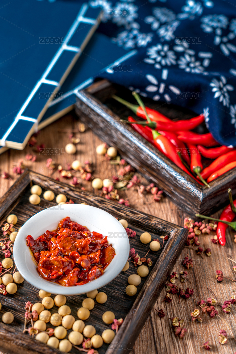一碟郫縣豆瓣醬和辣椒、花椒、大豆