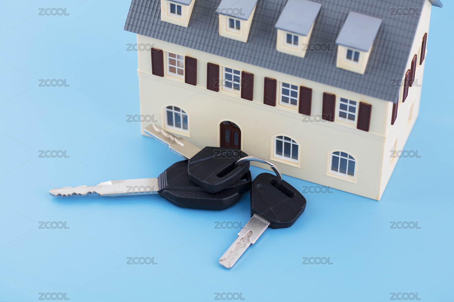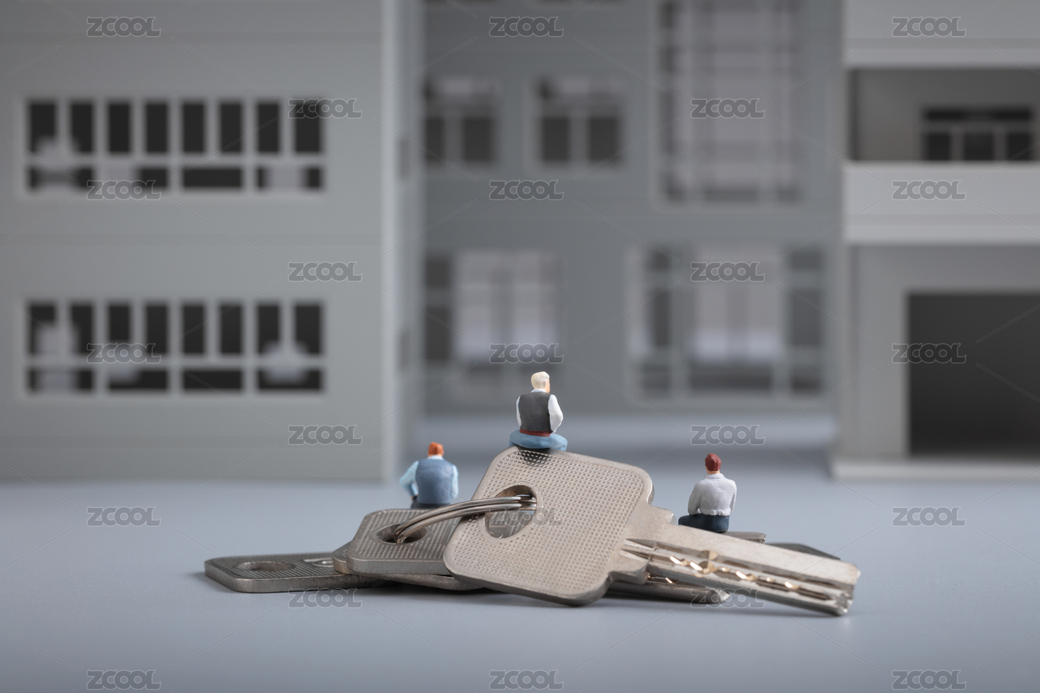 微縮創(chuàng)意樓房下一串鑰匙上坐著思考的男性