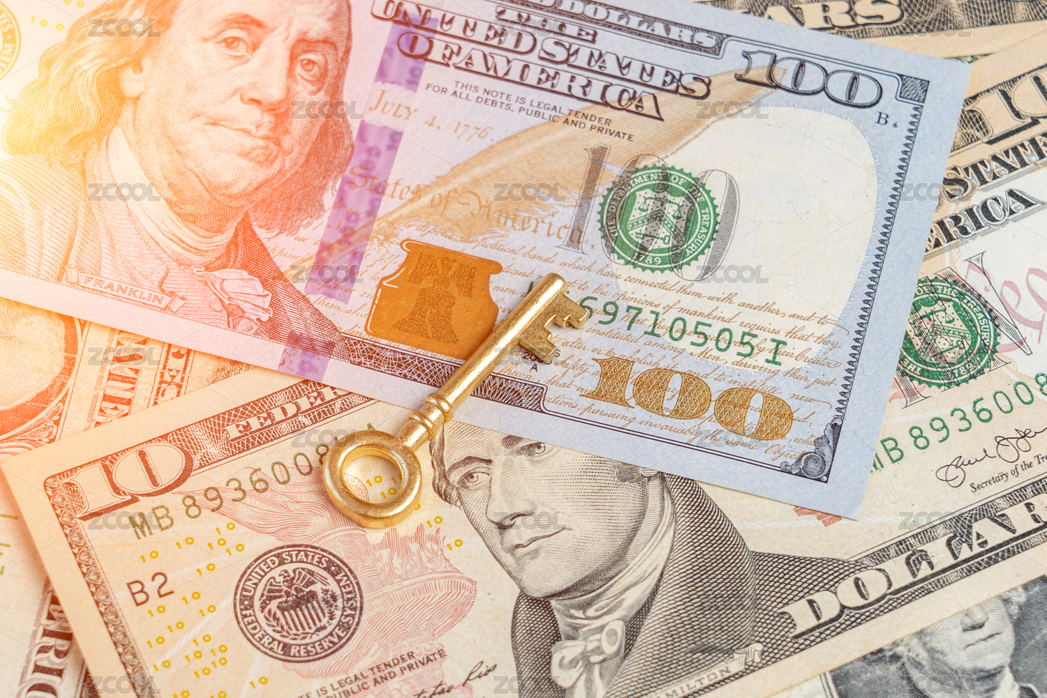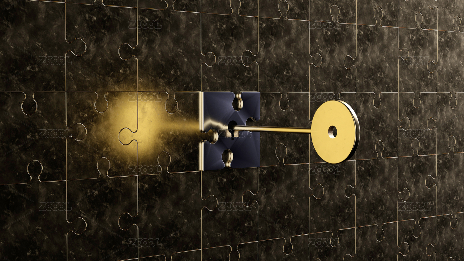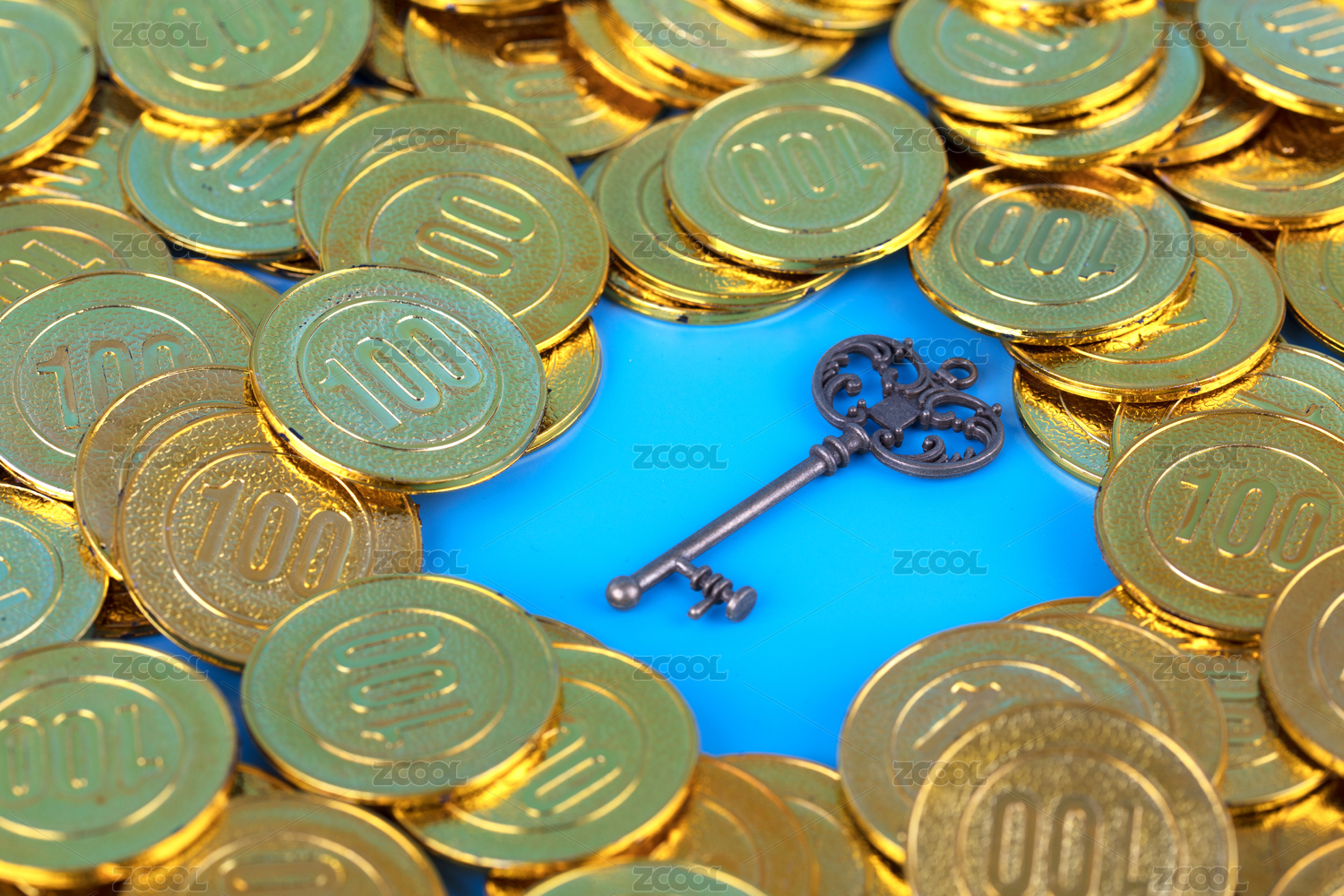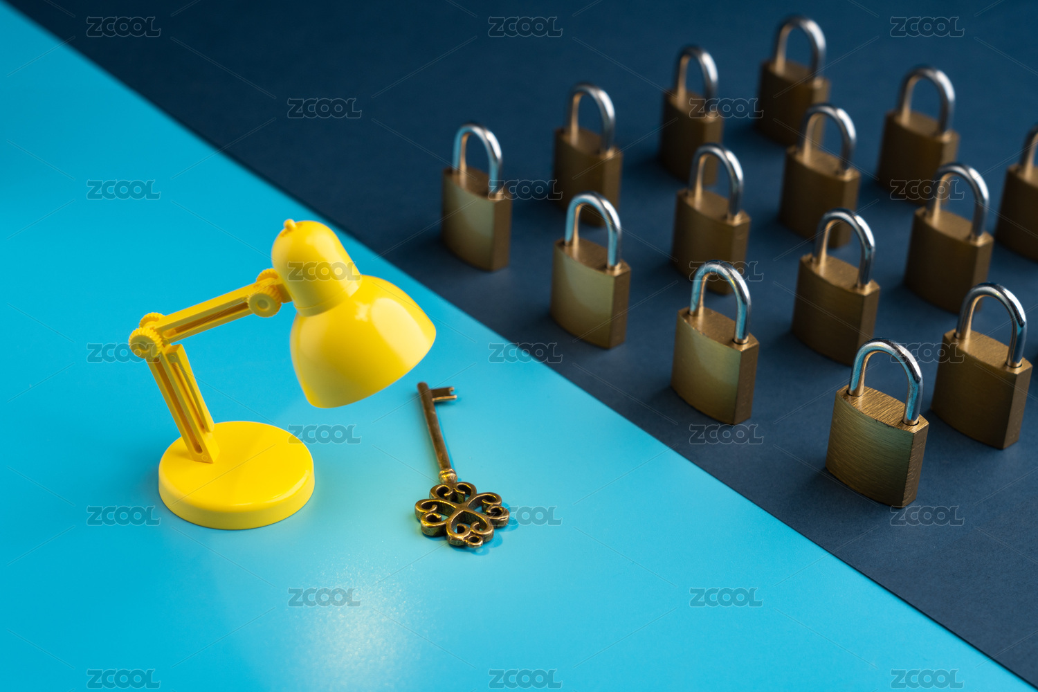 藍(lán)色背景下的鑰匙臺燈和鎖微縮創(chuàng)意圖特寫鏡