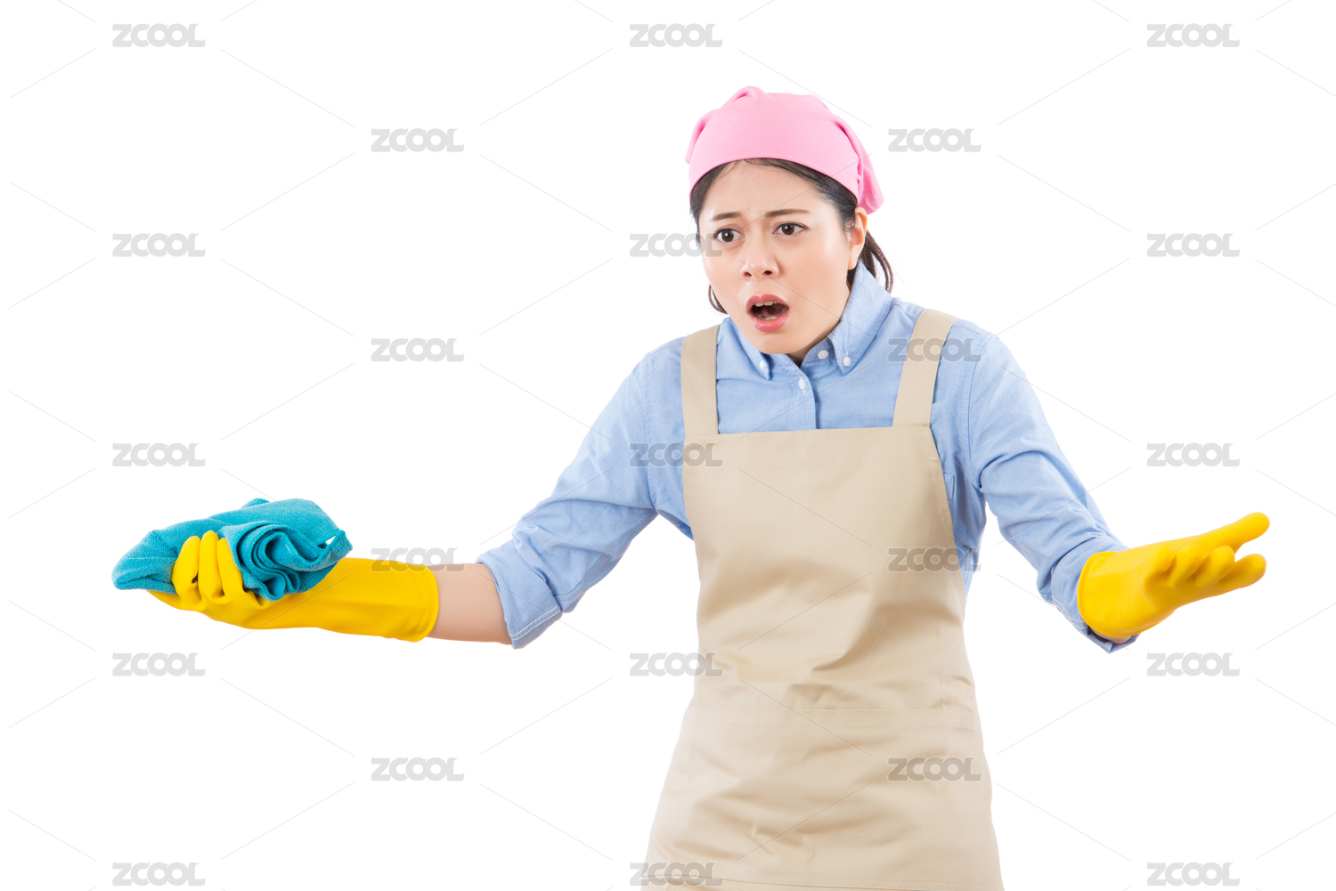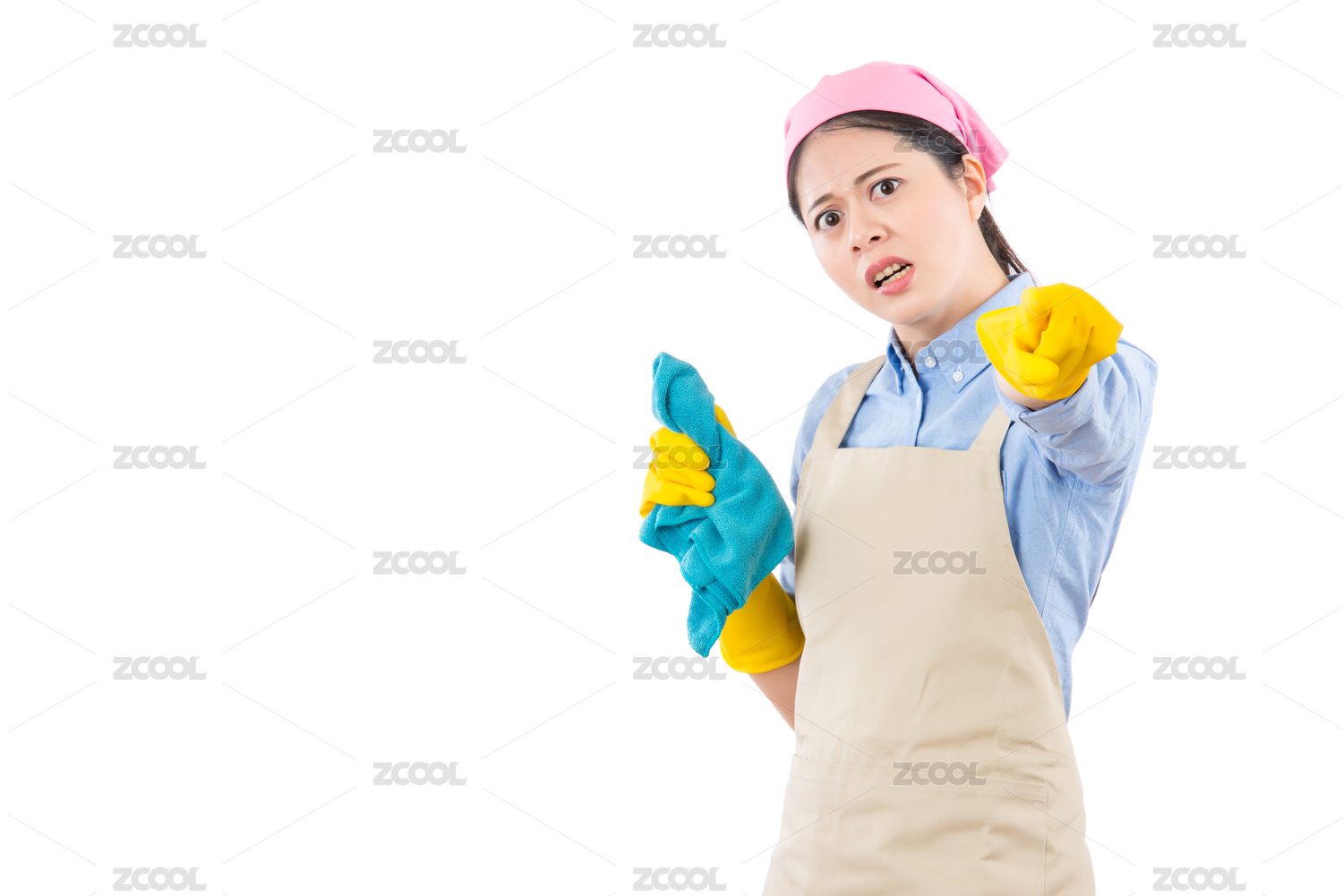 失望的不快樂的家庭主婦用黃色手套的手指指著罵你的錯誤。隔絕在白色背景。家務(wù)勞動和家庭保健理念。