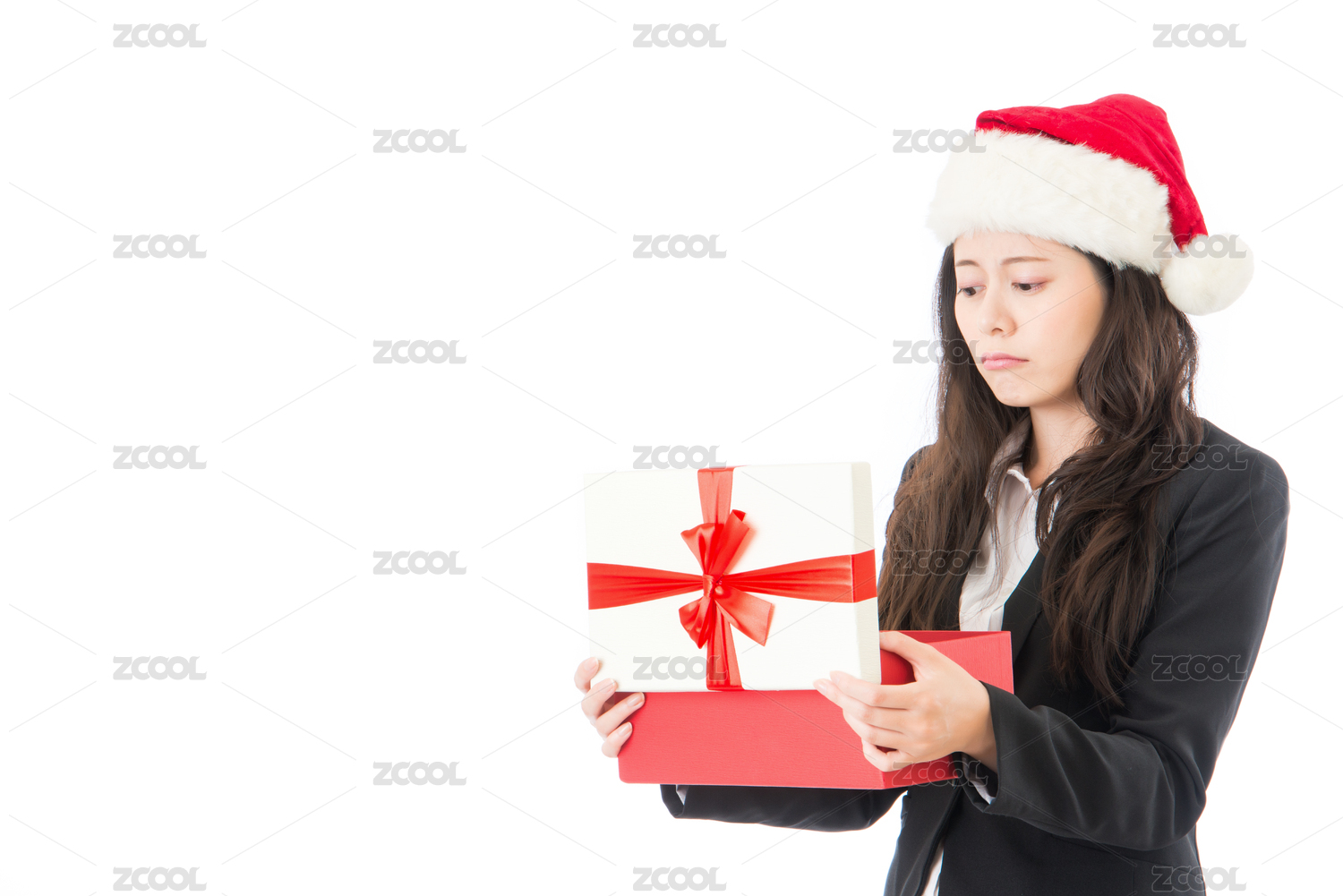 女子打開圣誕禮物感到失望和不滿,年輕女子在圣誕老人的帽子。隔絕在白色背景的亞洲女人的滑稽可愛的照片。