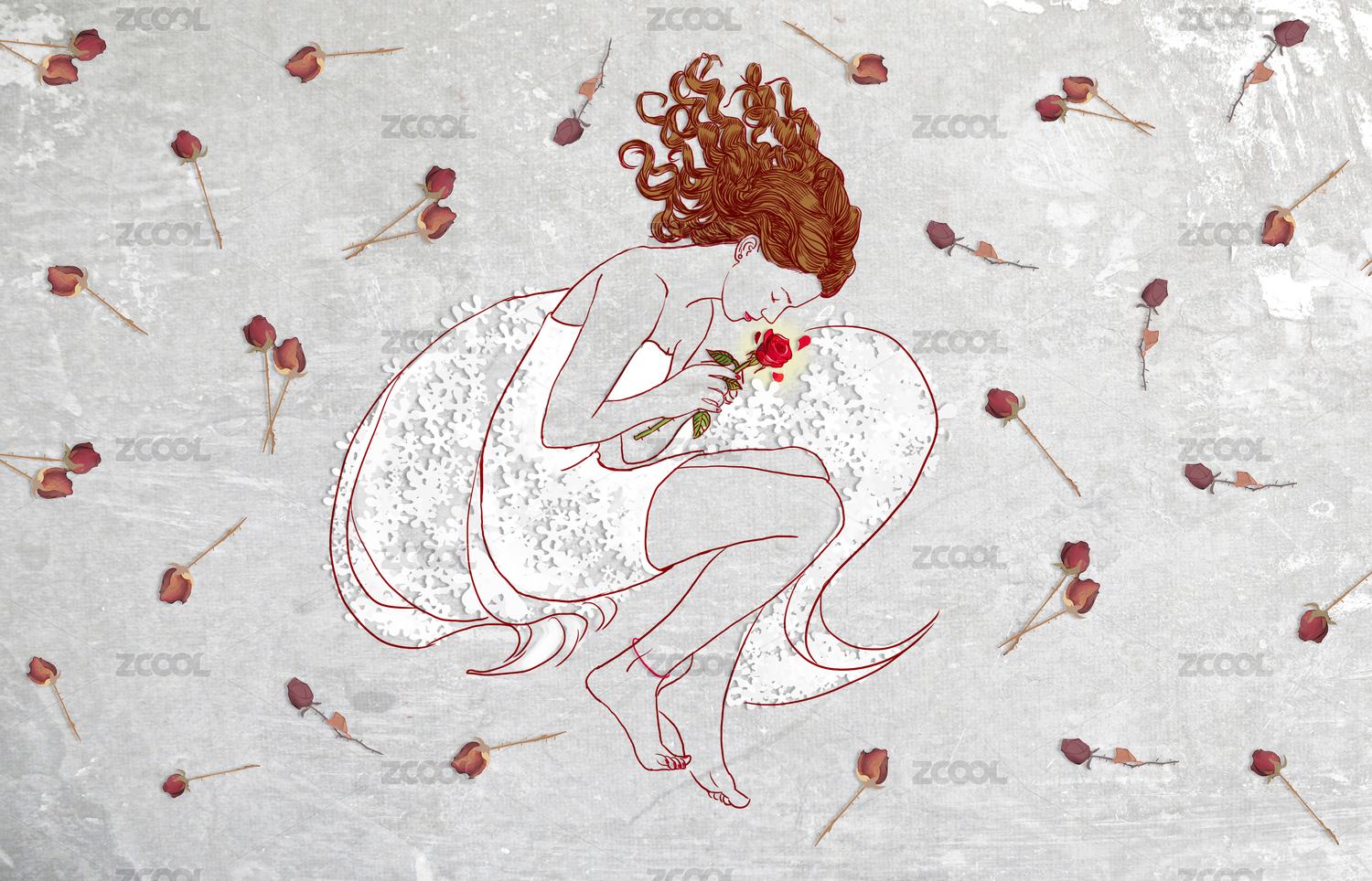 懷有美麗愛情夢想的少女,周圍環(huán)繞著干枯的玫瑰