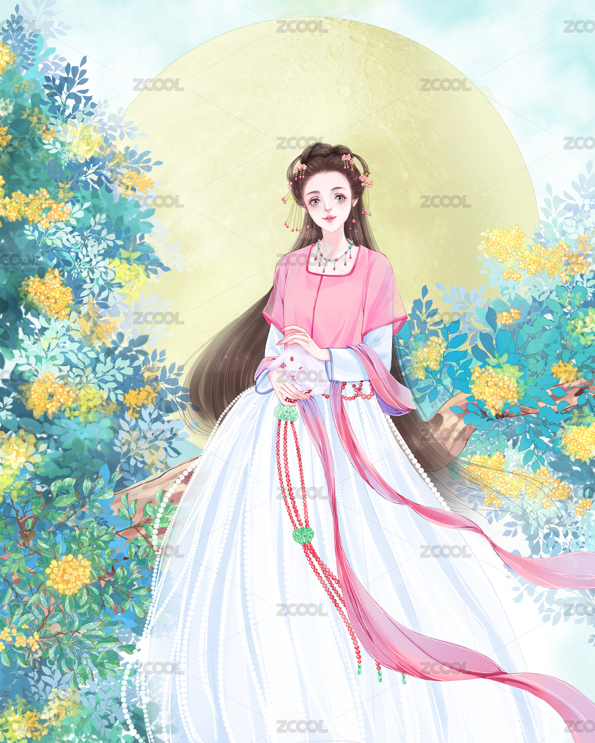 中秋 月圓坐在桂花樹梢上抱著兔子的少女