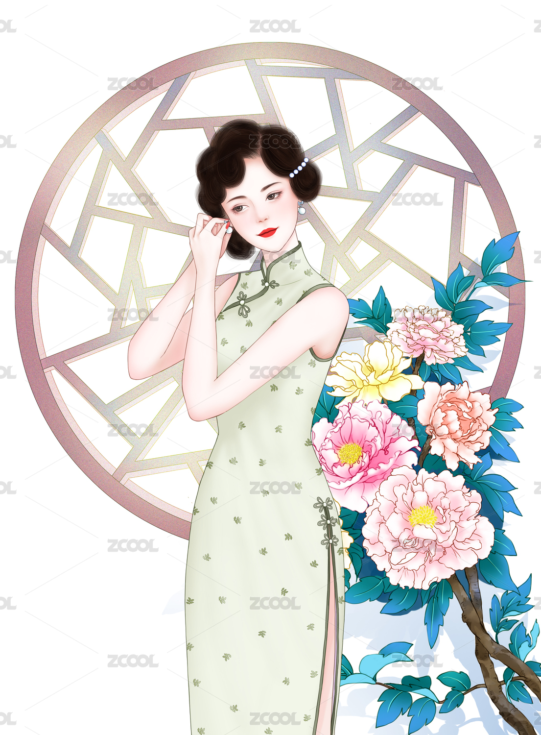 旗袍美人系列之牡丹帶耳環(huán)的少女