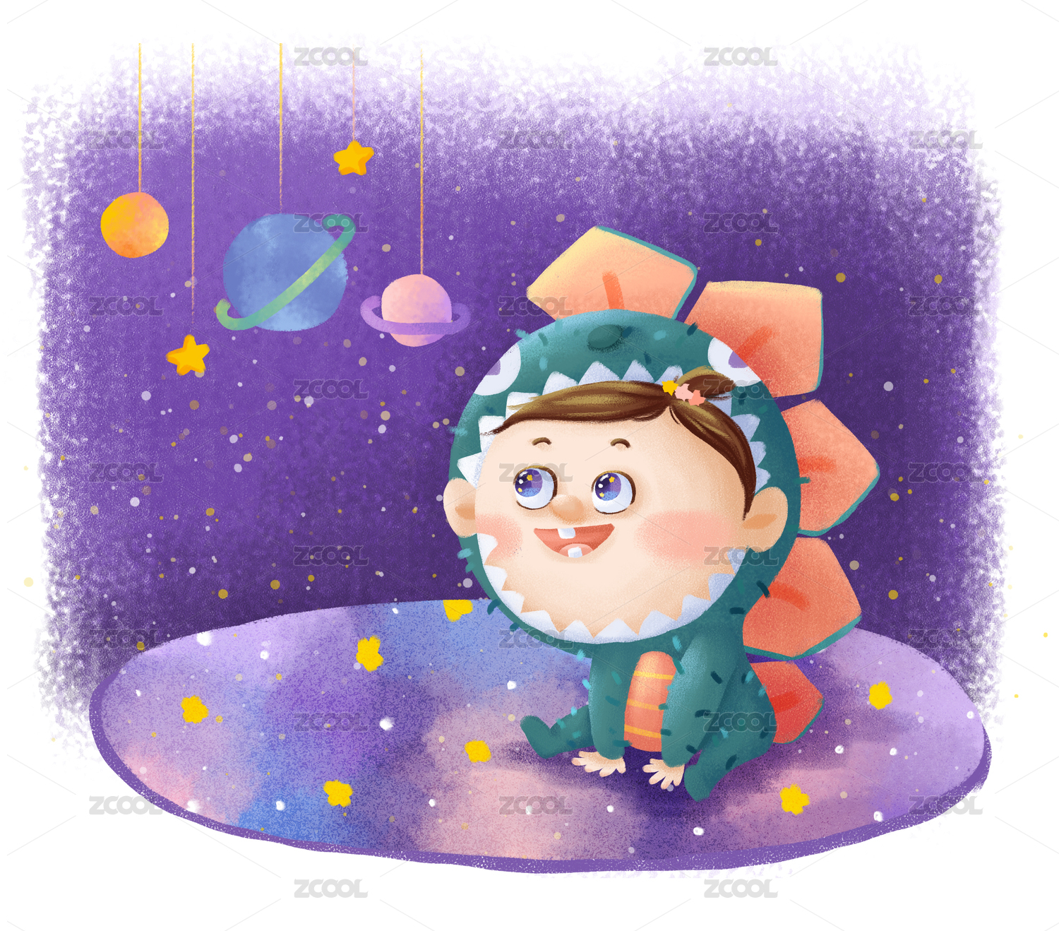 穿著綠色恐龍衣服的小女孩兒在看房間里的星