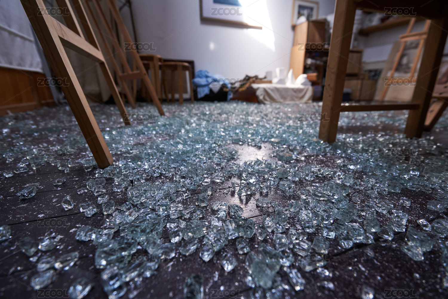 木質(zhì)地板上碎了一地的鋼化玻璃碎片2
